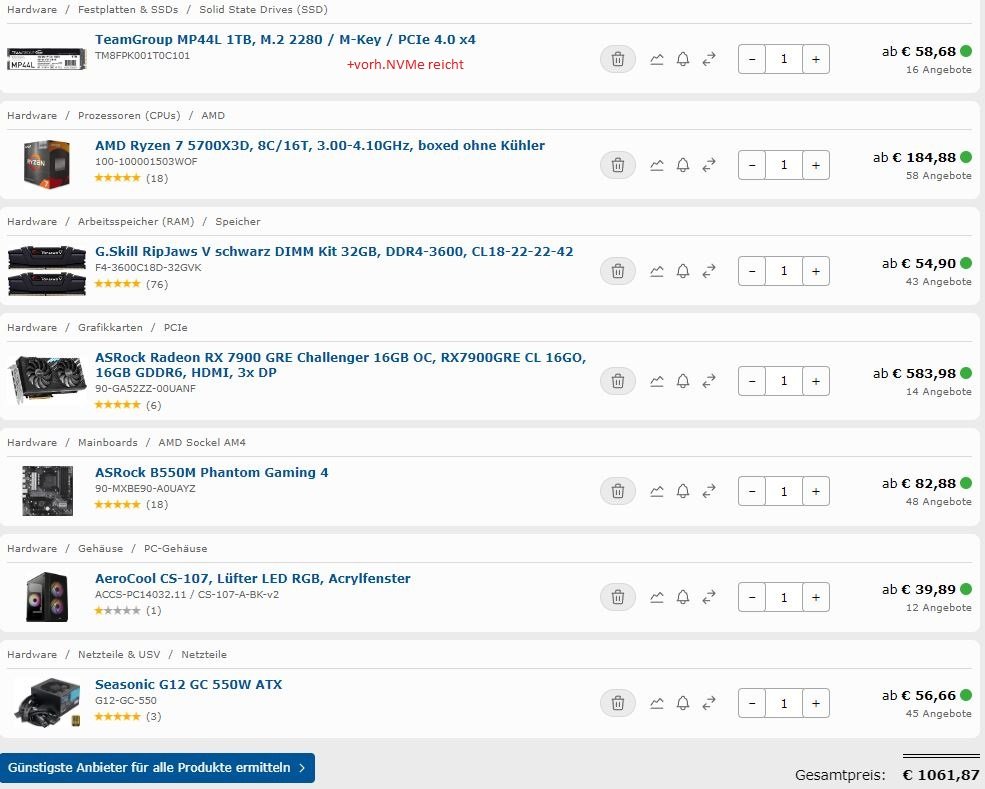 Der Ryzen 5 3600 im günstigsten System muss gegen den inzwischen unter 100 Euro günstigen Ryzen 5 5600 getauscht werden, so wie das inzwischen auch die CPU-Kaufempfehlung von CB gemacht hat.