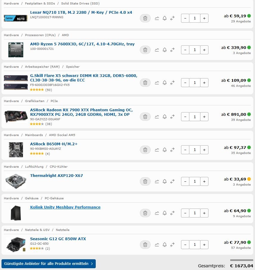 Stattdessen sieht man hier einen überteuerten R7 7800X3D mit einer RTX4070TiS mit einem B650er mit unnötig guter Ausstattung.