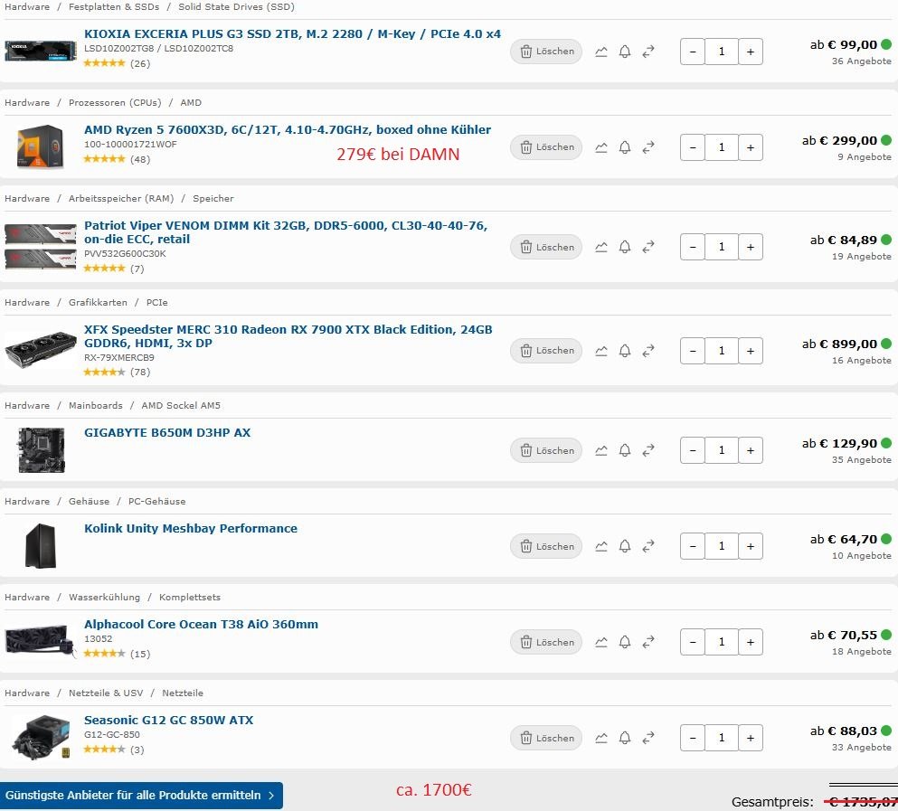 Thema entsprechende Nvidia GPUs steht natürlich auf der Liste, vermutlich wird es bei 2000€ auf die 7900 XTX hinauslaufen mangels realistischer Alternativen, Hinweis wollen wir entsprechend auch der aktuellen Situation anpassen.