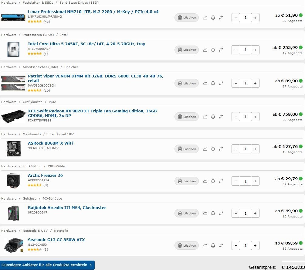 Wenn du, Stand heute, beispielsweise einen Intel 265k mit einer RTX 5070ti kombinieren wolltest, so kannst du das jetzt tun. Die Preise sind dort mittlerweile im Rahmen. Die Preisentwicklung siehst du über "Geizhals". Der Dollarkurs spielt aktuell für uns.