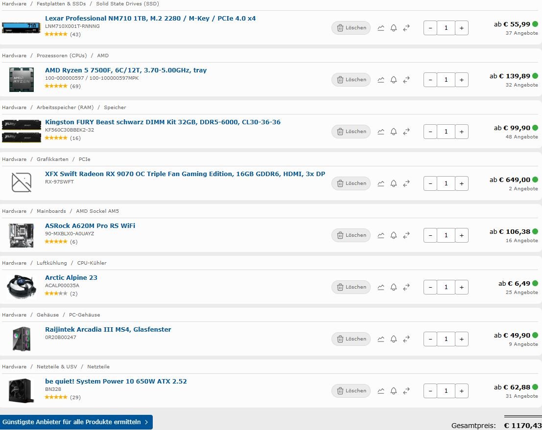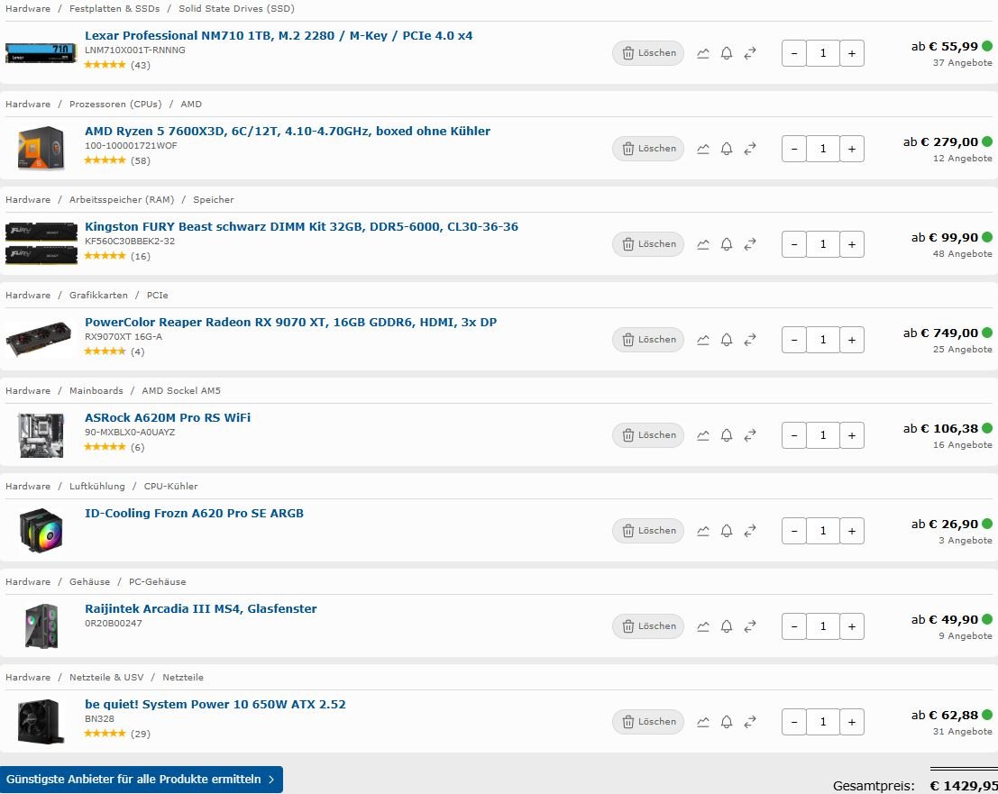 Am Ende landet man dann mit 9600X/14600 + 9070 bei ~1400€.