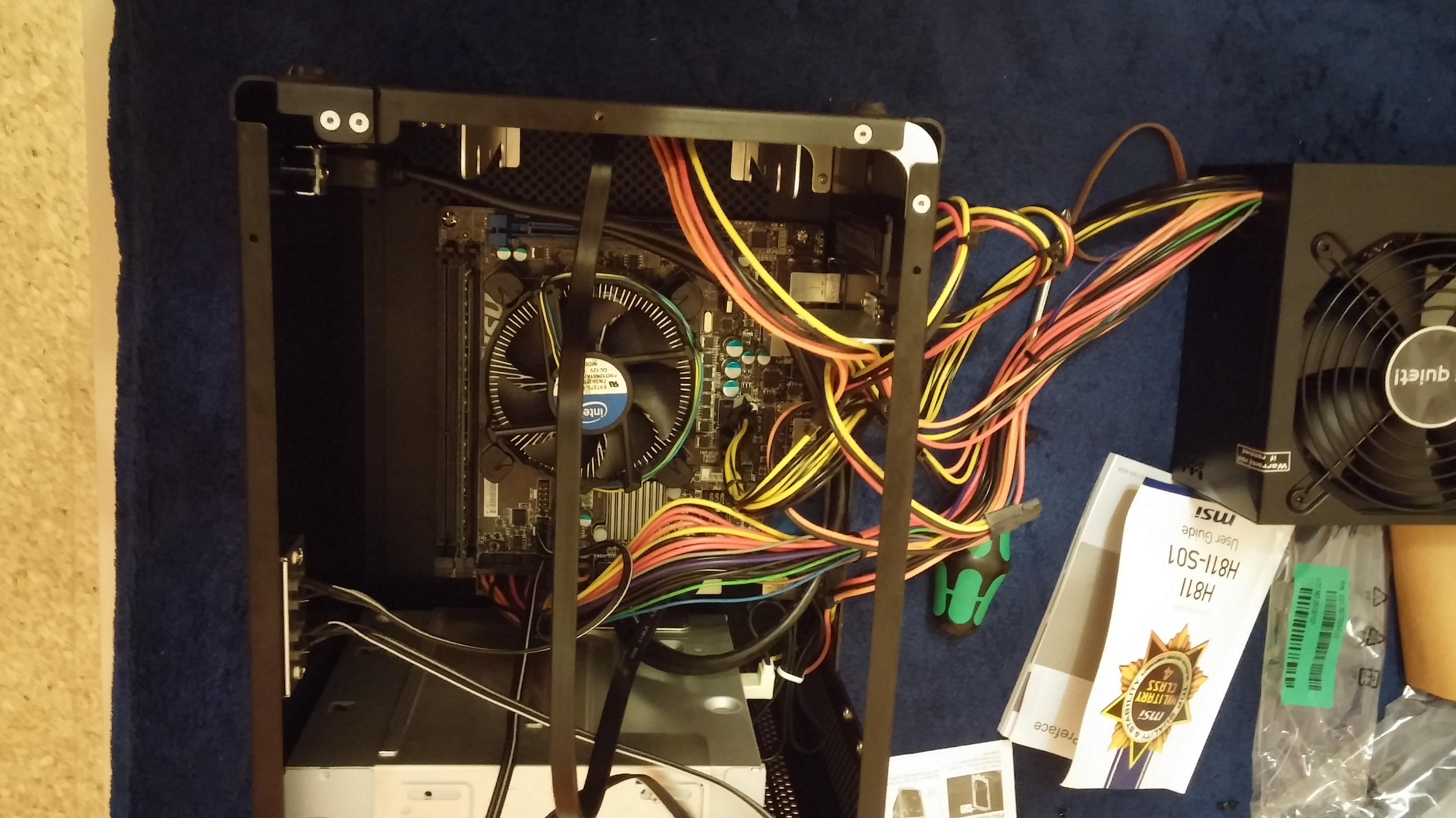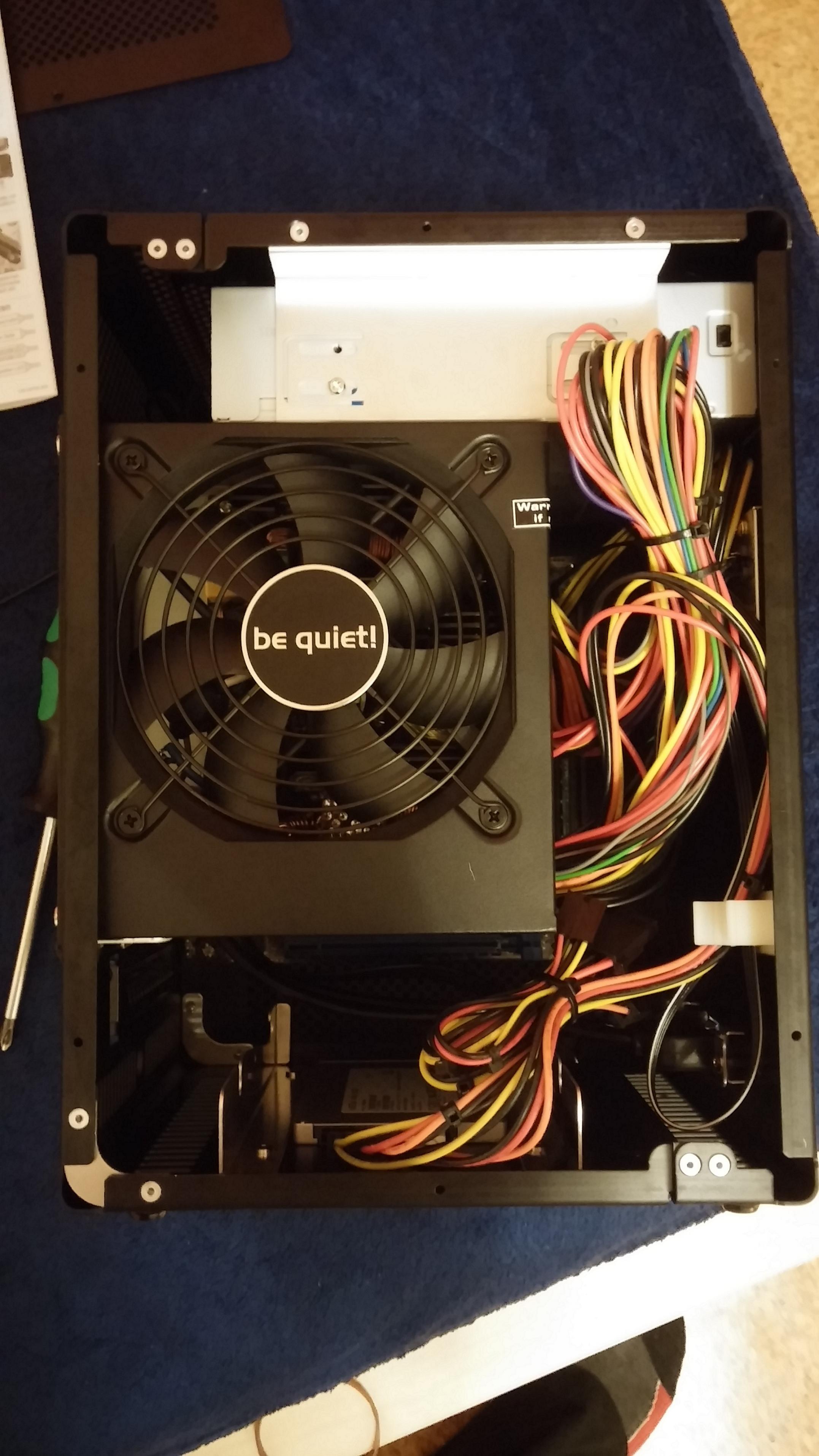 Schrittweise das Netzteil einschieben und währenddessen die Kabel per Kabelbinder platzsparend sortieren und darauf achten, dass der Boxed Lüfter nicht in die Nähe der Kabel kommt.