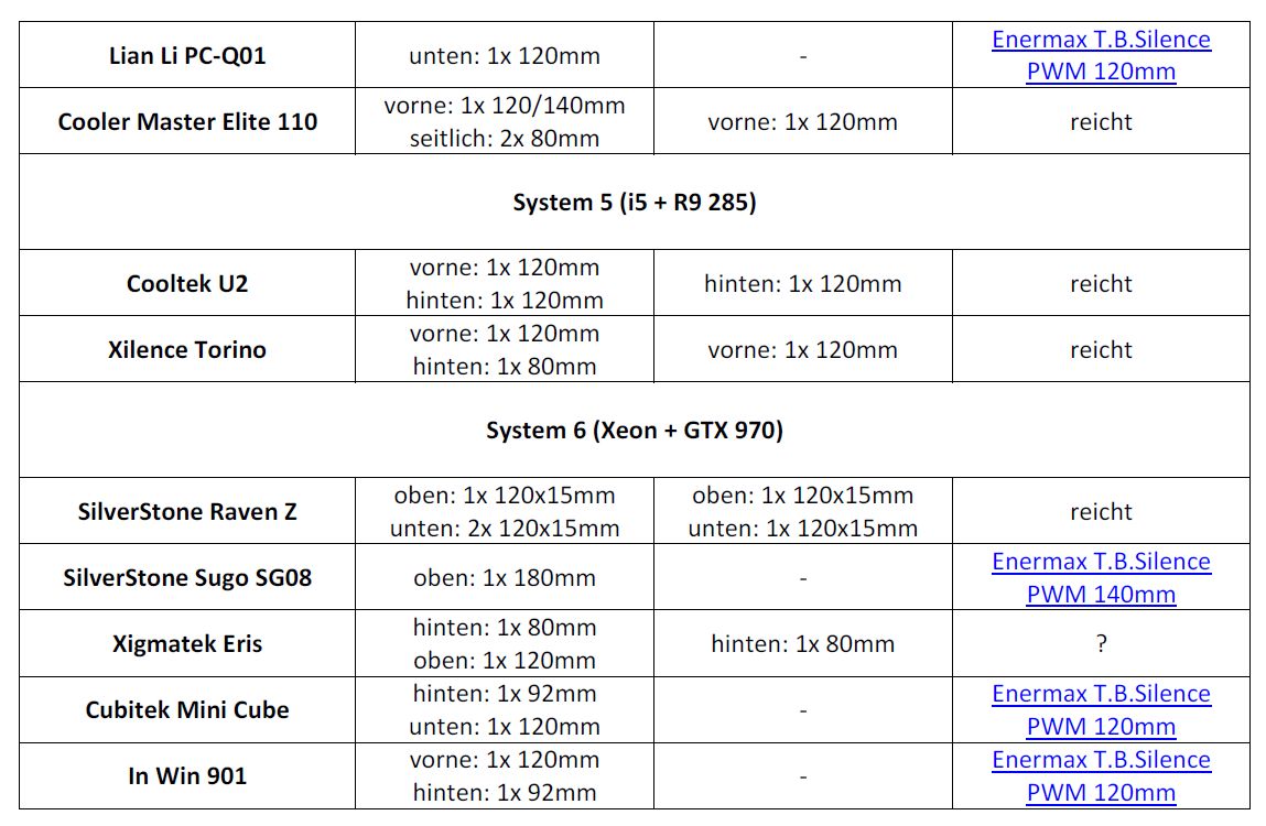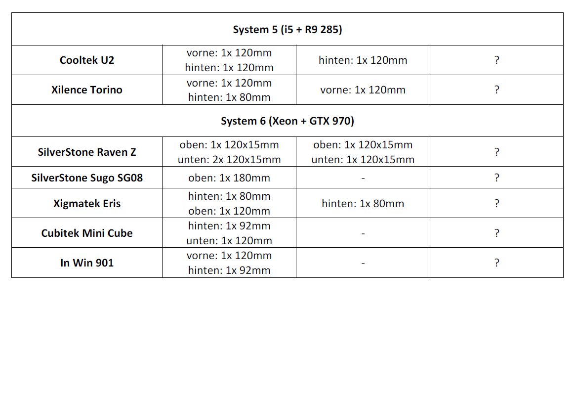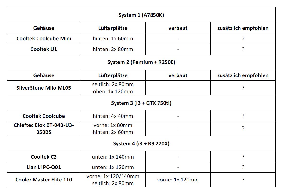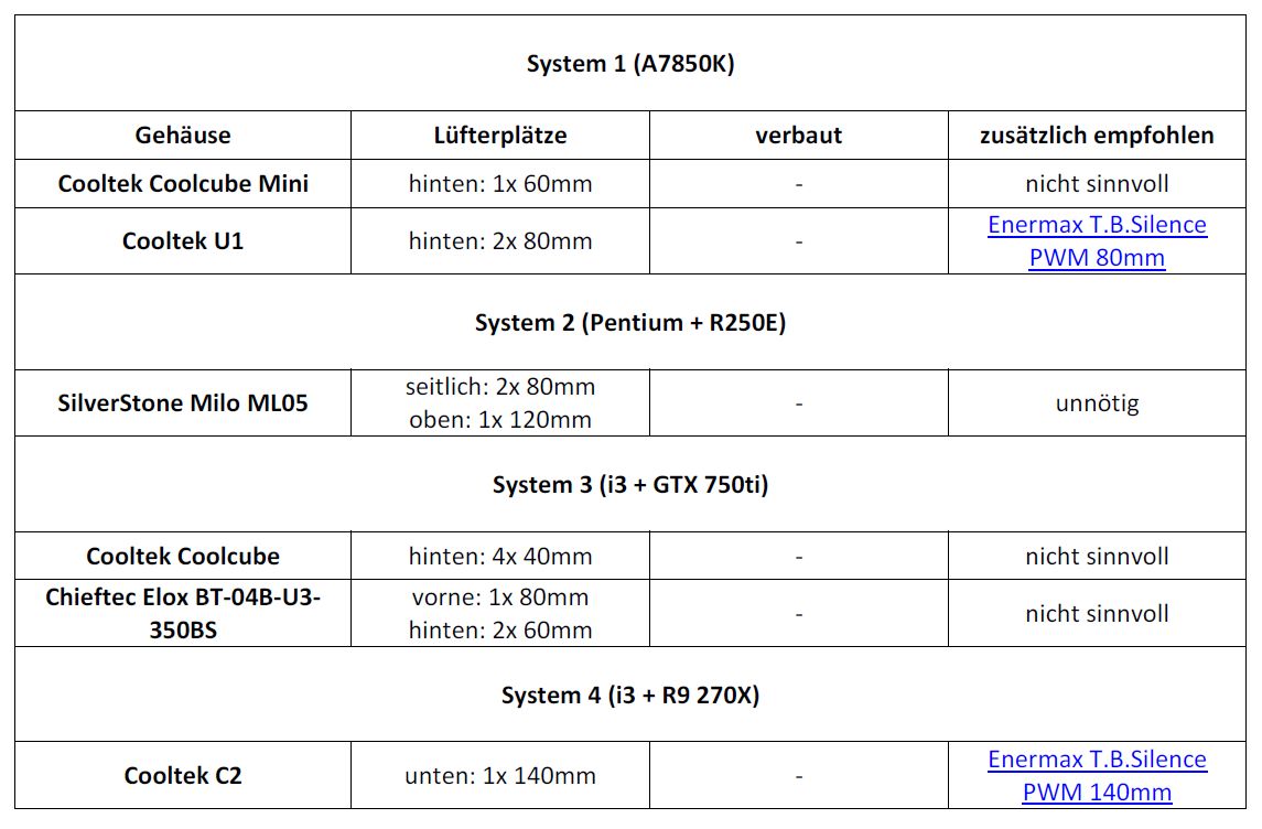 Ich denke, bei den Systemen 2 und 3 sind aufgrund der geringen Abwärme keine weiteren Lüfter nötig und bei manchen Gehäusen wäre dies m.M.n. eh nicht sinnvoll (Beispiel Coolcube mit 40mm-Lüftern). Recht einfach ist es auch bei den drei Gehäusen aus System 6, die ganz ohne Lüfter geliefert werden, da werde ich einen empfehlen.
