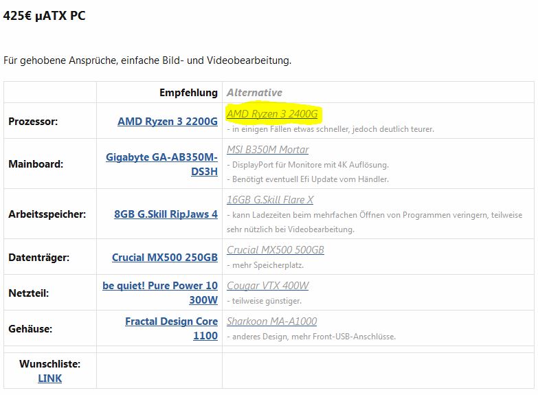 Natürlich gehen die Meinungen was tatsächlich "ausgewogen" ist teilweise ziemlich auseinanter, wenn man aber bei allen Komponenten das billigste raussucht, was noch irgendwie vertretbar ist, nur um einen Ryzen in der Zusammenstellung unterbringen zu können, dann halte ich es nicht mehr für ausgewogen und es erinnert mich an so manch einen fertig PC, der groß mit der schnellen CPU beworben wird, bei dem der Rest aber mehr als nur bescheiden ist. (Einen derartigen fertig PC bekommt man übrigens, sofern man eine Windows Lizenz mit einrechnet, spätestens in ein paar Wochen vermutlich sogar günstiger als man ihn selbst bauen könnte.)