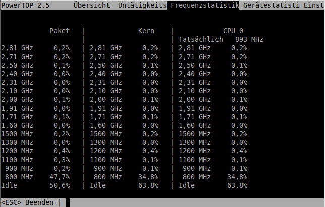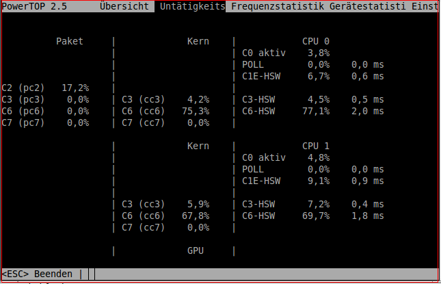 DDD schrieb:Die Screens vom Powertop sagen aus dass links nur C2 Paket State genutzt wird, das könnte bis auf C6 runter, wobei ich da nicht weiß was man dafür unter Linux machen muss, bin da auch noch am forschen.