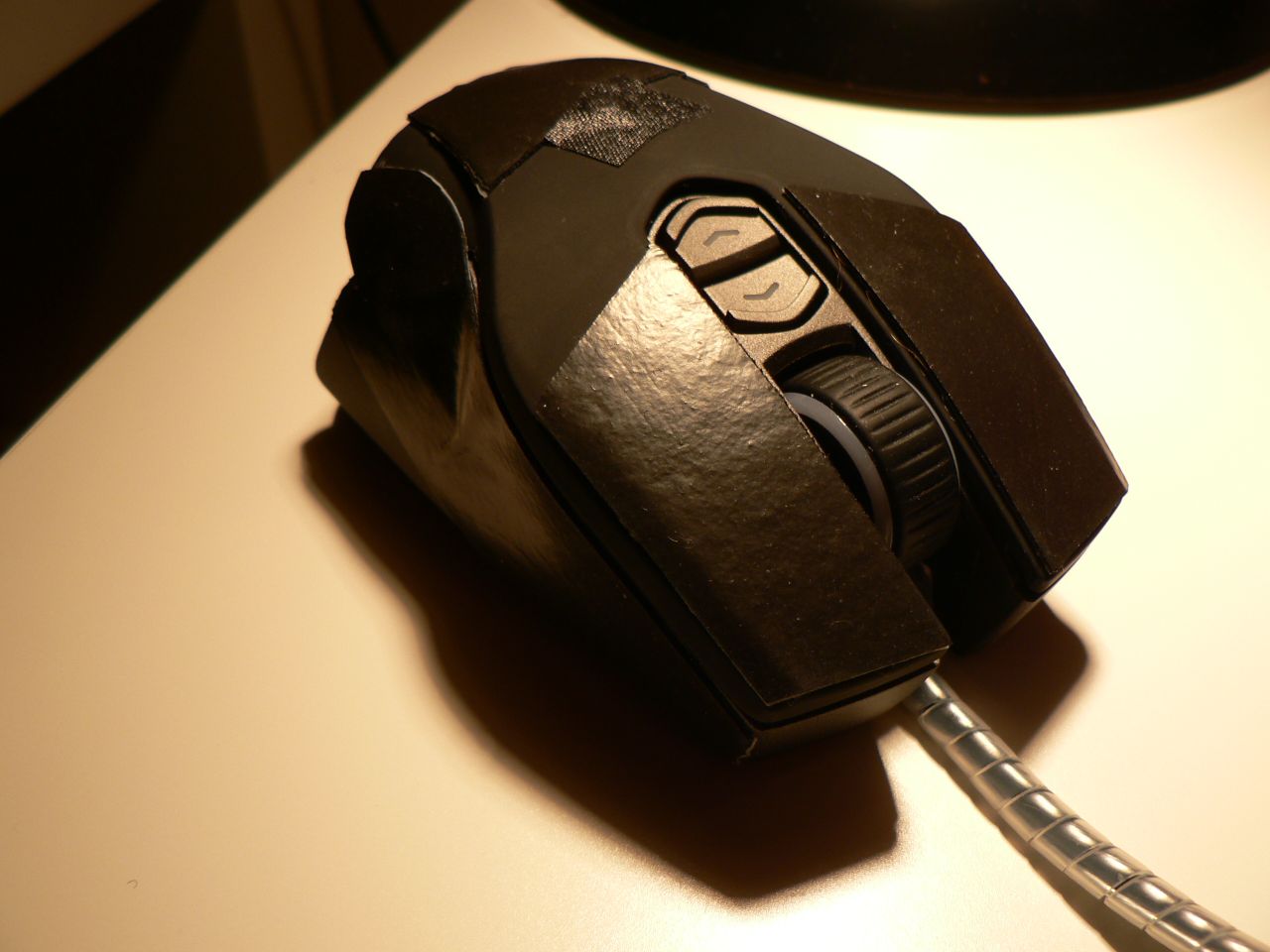 Mit durchsichtigem Doppelklebeband auf die Maustasten 1+2 und an die Seiten angebracht.