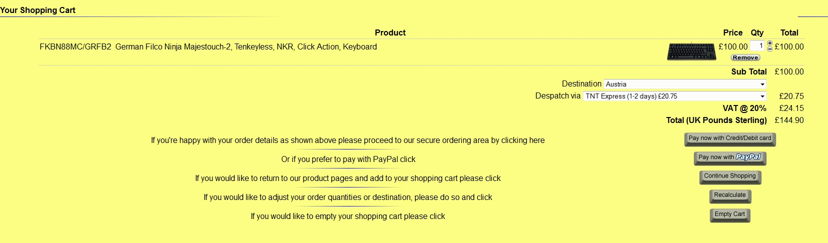 Keine Ahnung wie ihr alle immer auf diese horrende Preise kommt, aber eine Filco TKL mit Blues von KeyboardCo nach Österreich kostet 128,70 GBP, also ca. 150,01 €...
