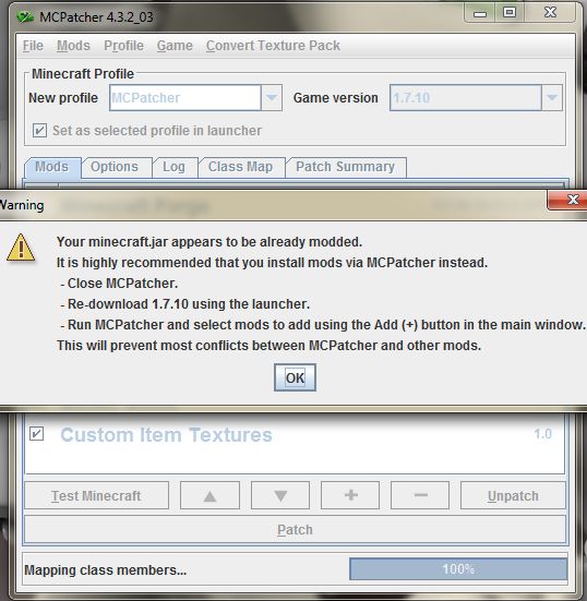 Den Patcher brauchst du nicht meh rum die Packs zu installieren. Wenn die Meldung kommt dass dein MC bereits gemodded sei, dann hast du bereits irgendwas an der jar geändert; auch dies muss eigentlich nicht mehr vorgenommen werden.