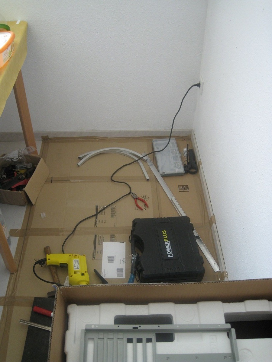 hier dürft ihr meine selbstgebastelte Bastelecke in meiner Küche begutachten ( ich kann echt froh sein das meine Freundin da recht tolerant ist). Desweiteren meine aus einem alten Chieftec entfernte Blende fürs Mainboard sowie mein Werkzeug das endlich geliefert wurde.