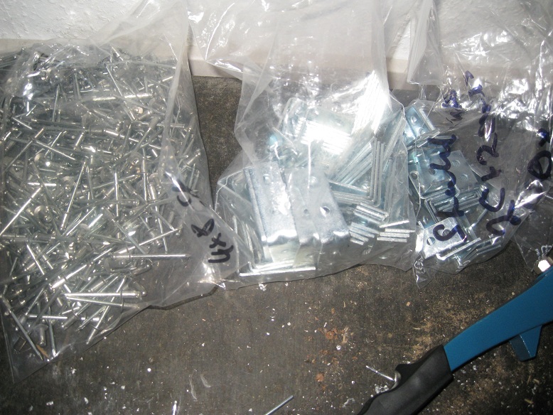 Bis auf meine Profile, also das wichtigste, ist nun alles relevante vor Ort. Das komische Gebilde ist mein Nietexperiement mit Abfallteilen, dessen Sinn und Zweck war eine Methode zu finden damit meine Winkel bündig mit den Profilen abschließen. Des Rätsels Lösung ist einfach die Winkel mit doppelseitigem Klebeband zu fixieren und dann zu bohren. Übrigens die hier gezeigeten Winkel und Nieten sollten größtenteils verbraucht werden, was ne Menge Arbeit bedeutet.
