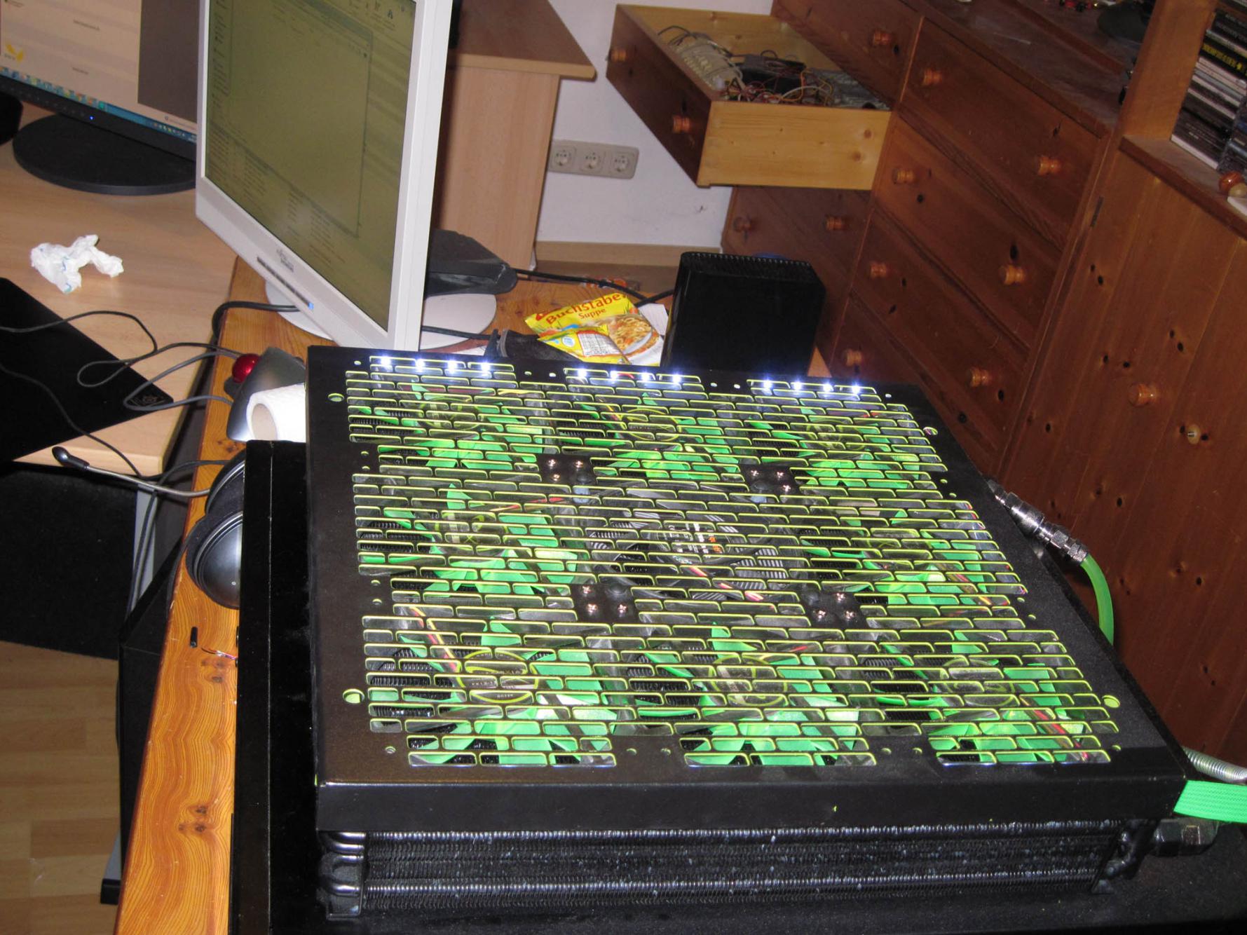 2 grüne + 2 weisse LED Stränge im Lüftergitter Rahmen des MoRa2
