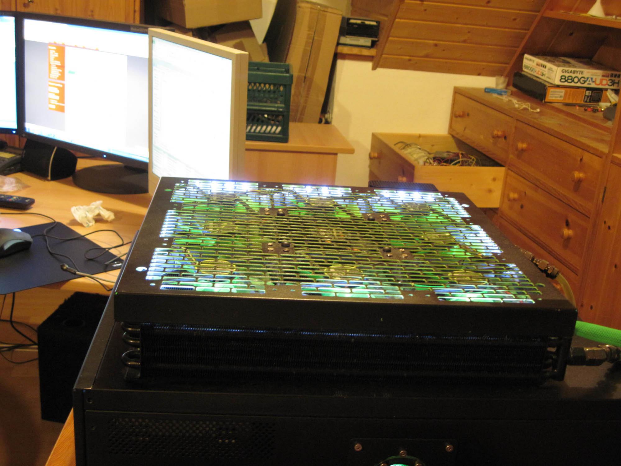 8 grüne und 8 weisse LEDs in einer Plexiglas scheibe unter dem Computer.