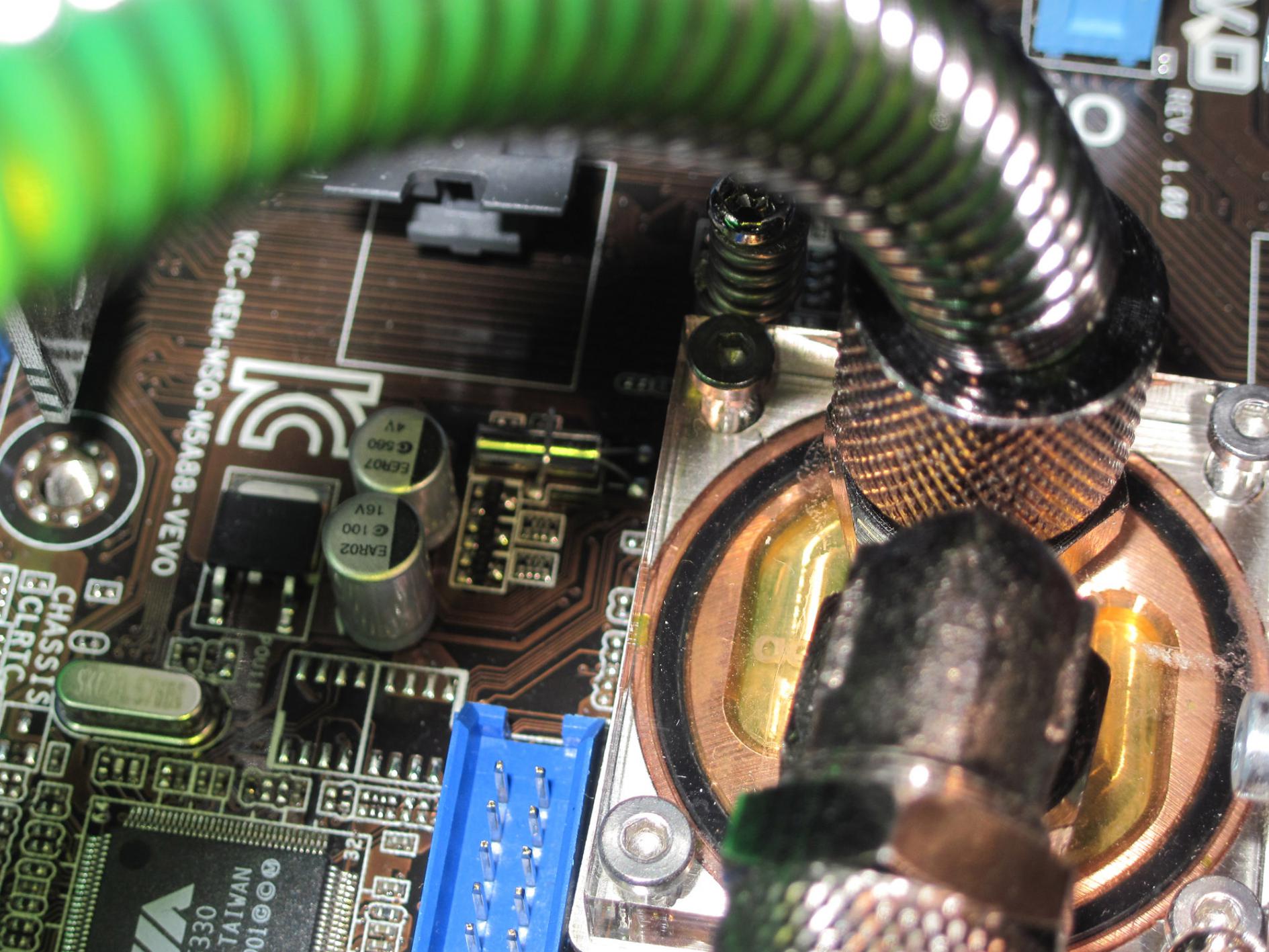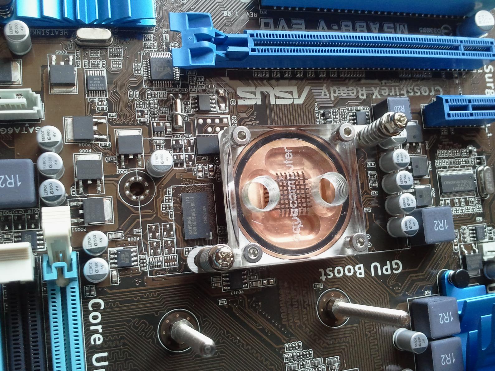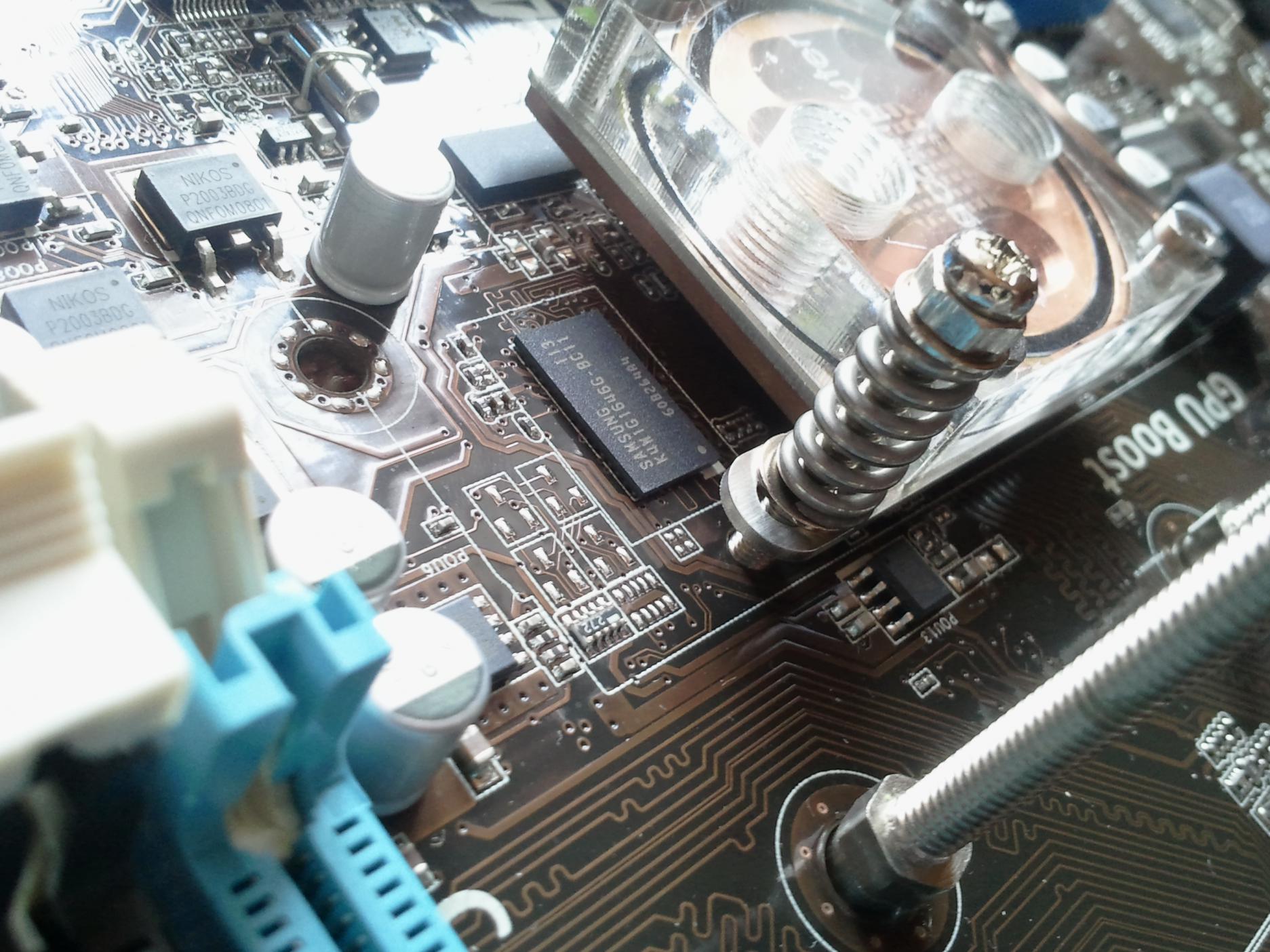 so mein Mainboard ist angekommen und rs funktioniert. selbst nach dem Einbau des Mainboard Wasserkühlers funktioniert noch alles. Ich habe den Kühler diesmal mit Wärmeleit-Klebepads montiert. Die Verbindung erfolgt durch eine kange M3 Metallschraube mit Metallfeder und Plastikmutter an der Mainboard Rückseite. Siehe Bilder.