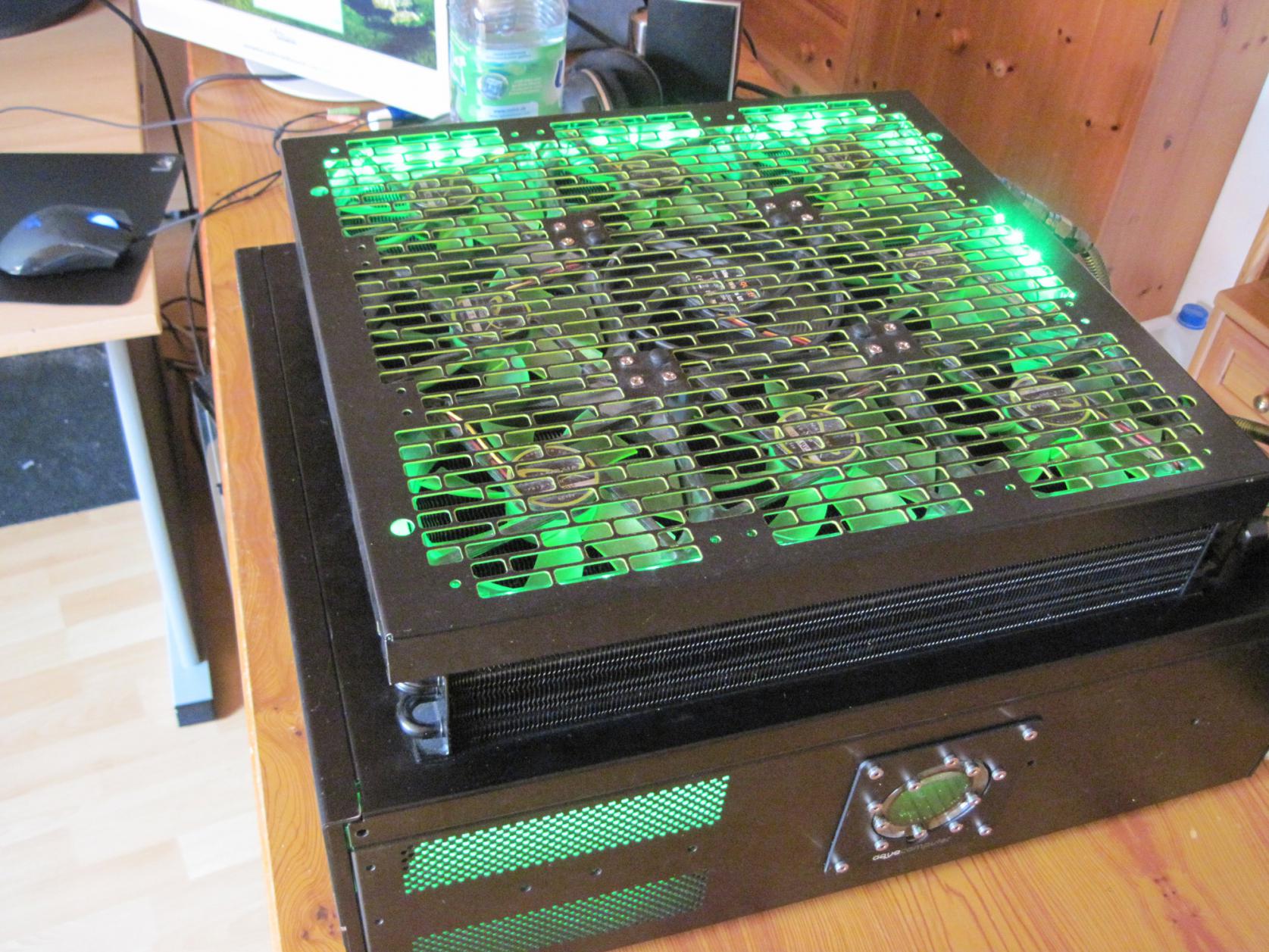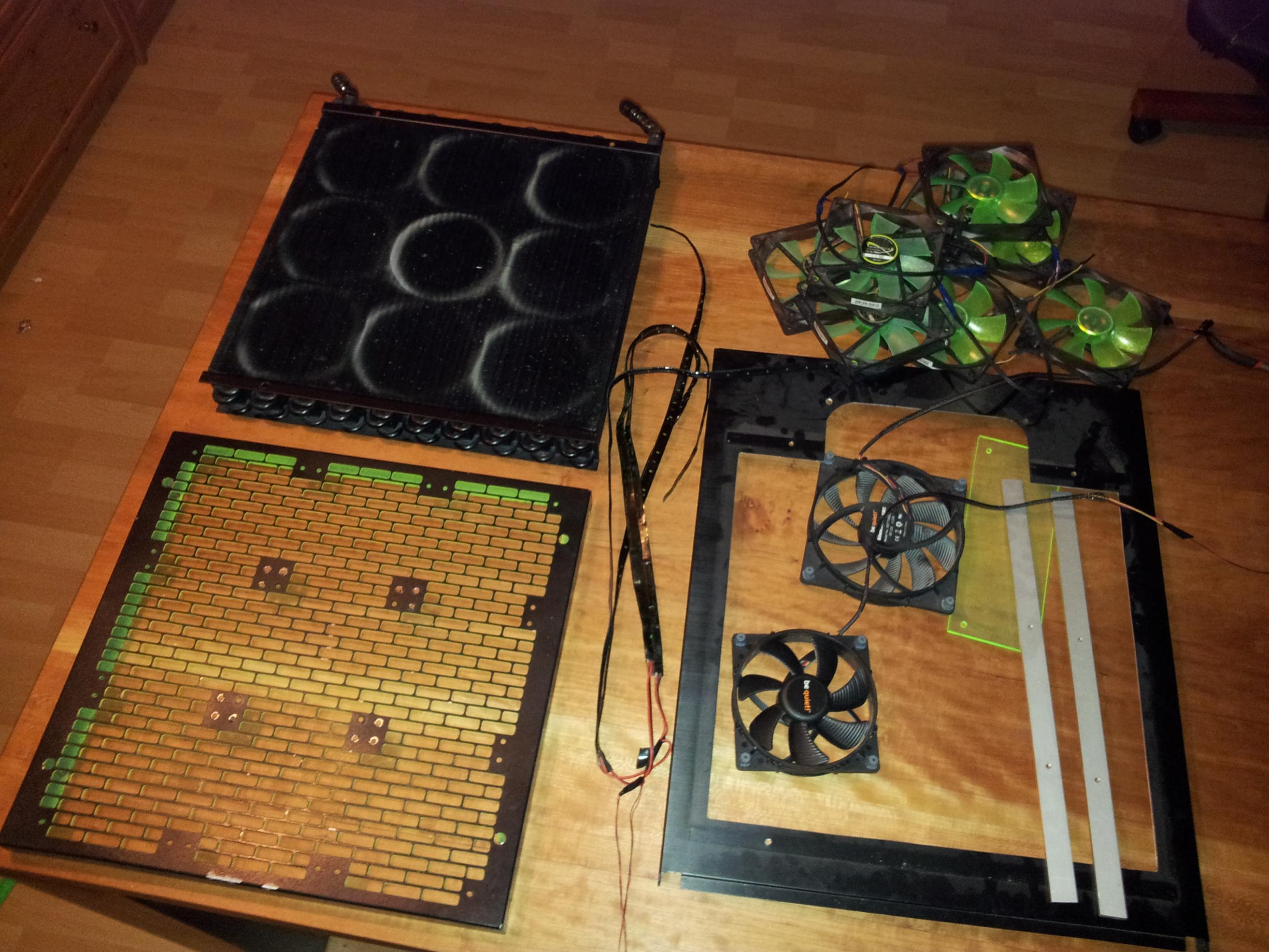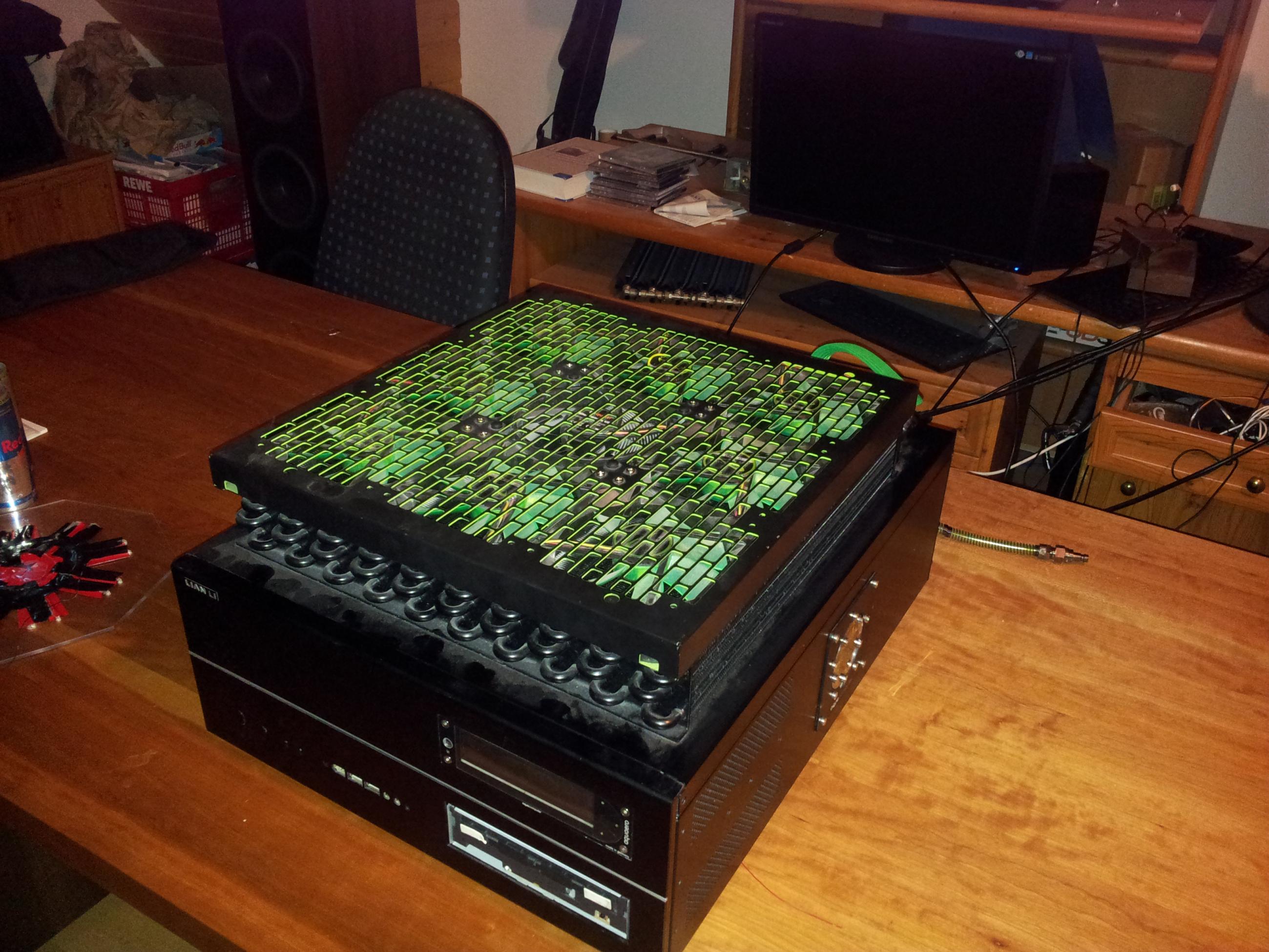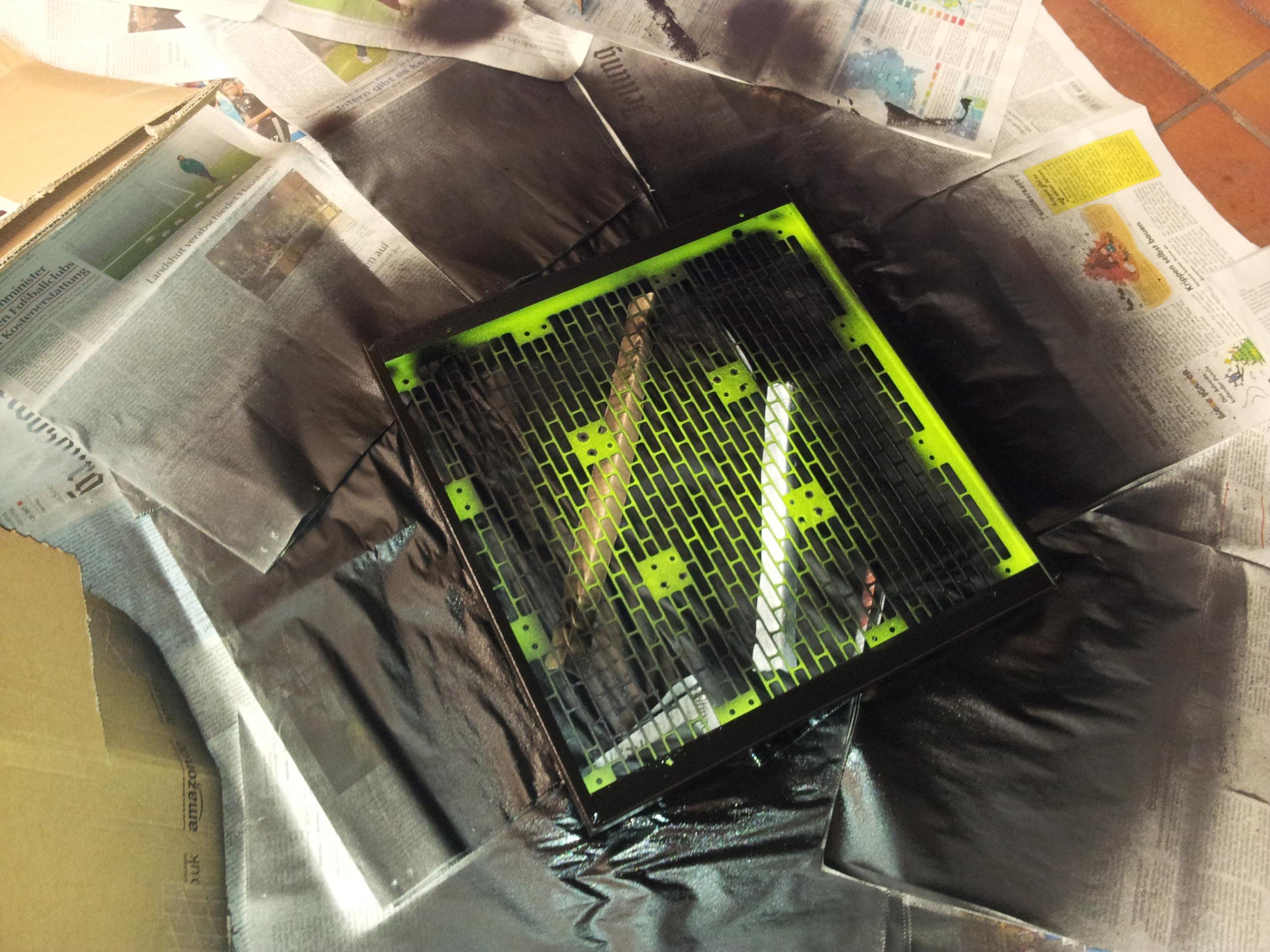 Morgen muss ich dann noch die Innenseite des Mo-Ra 2 Lüftergitters grün lackieren, und sofern mein Netzteil kommt, alles wieder zusammenbaun - was insbesondere beim Lüftergitter ziemlich viel Aufwand ist...