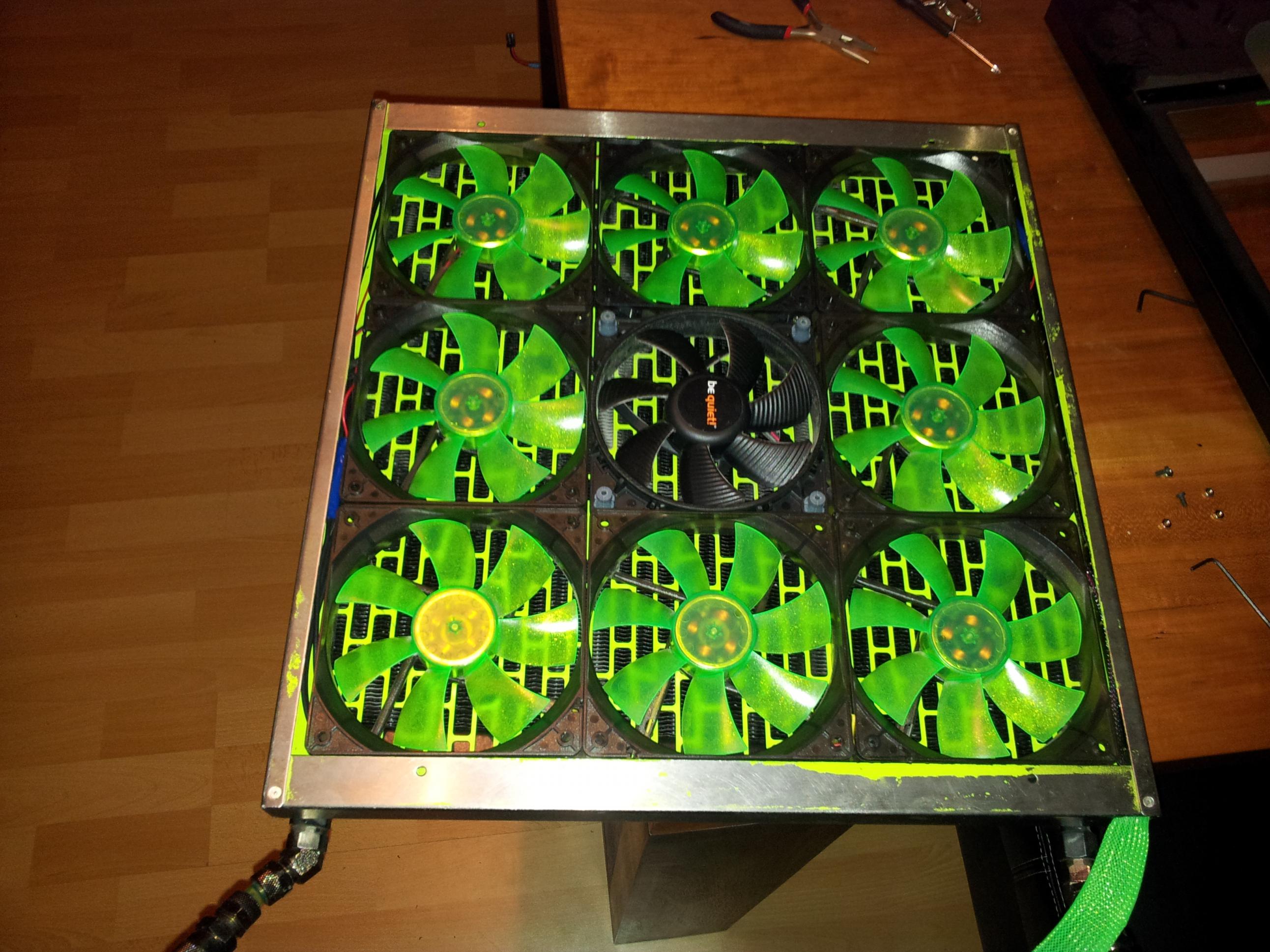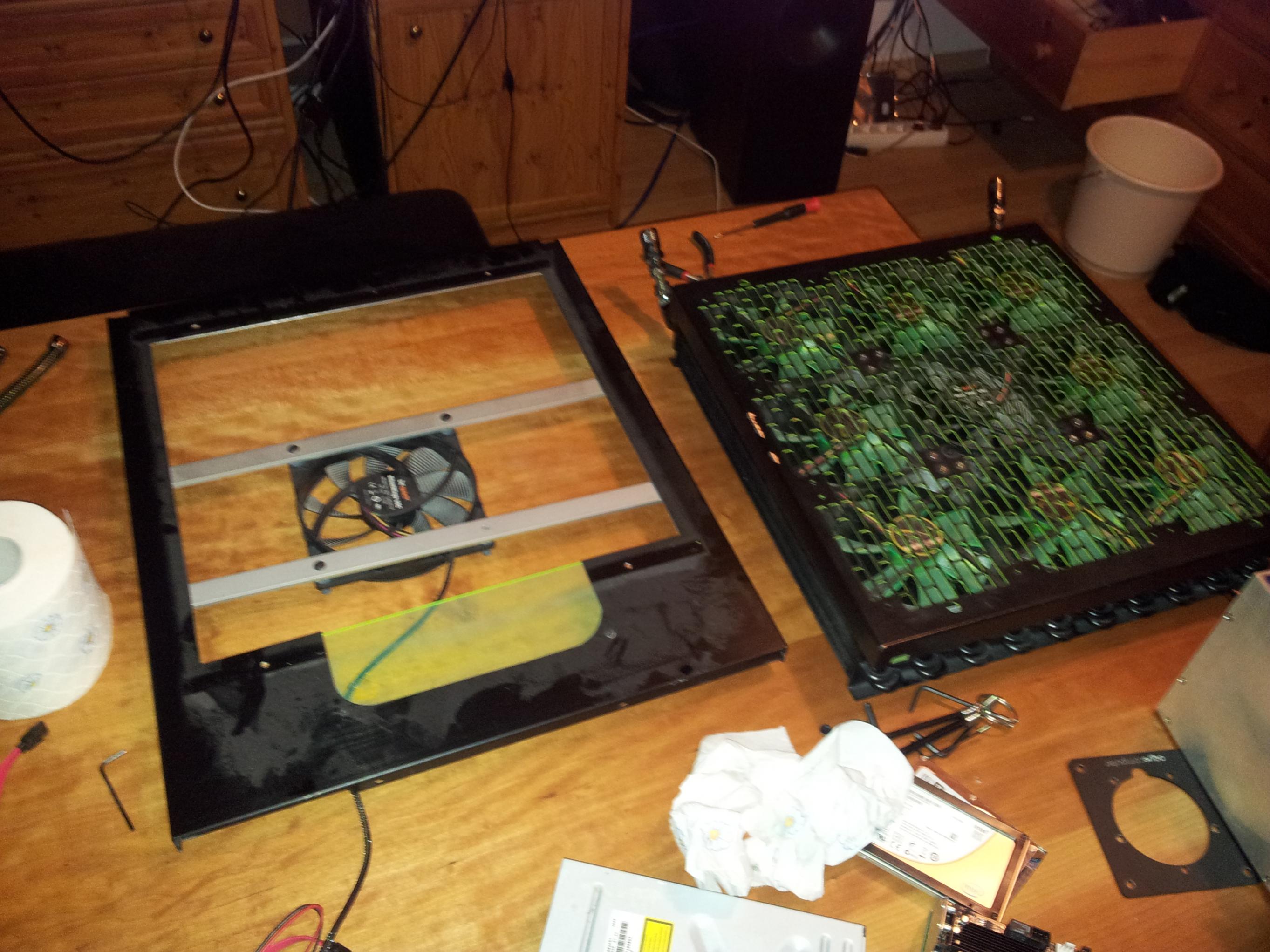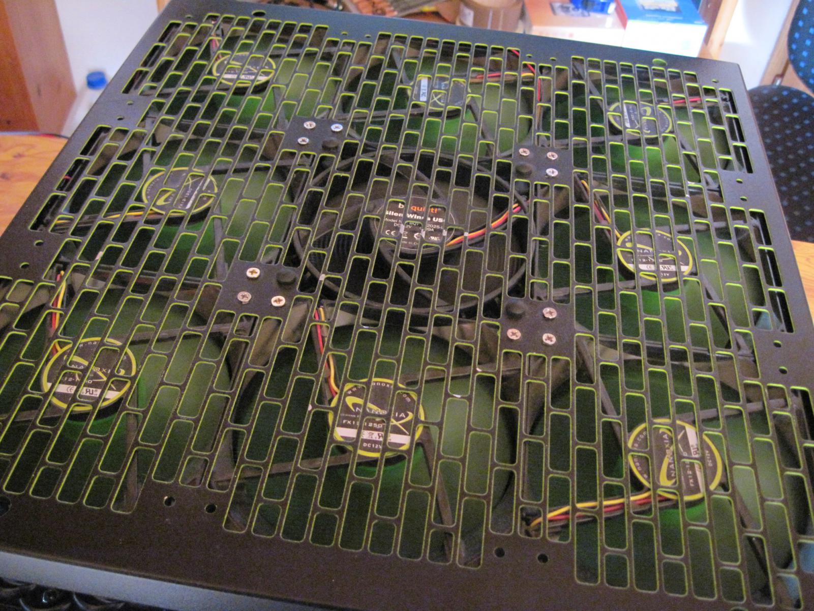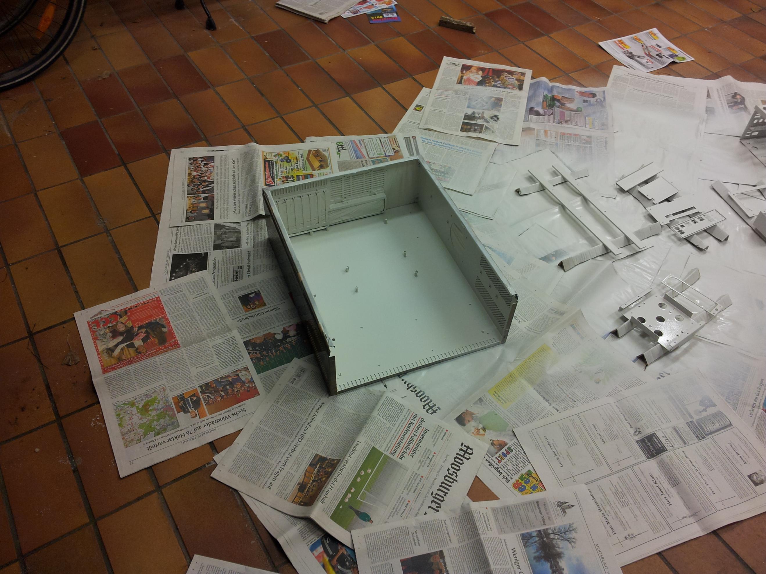 Morgen muss ich dann noch die Innenseite des Mo-Ra 2 Lüftergitters grün lackieren, und sofern mein Netzteil kommt, alles wieder zusammenbaun - was insbesondere beim Lüftergitter ziemlich viel Aufwand ist...