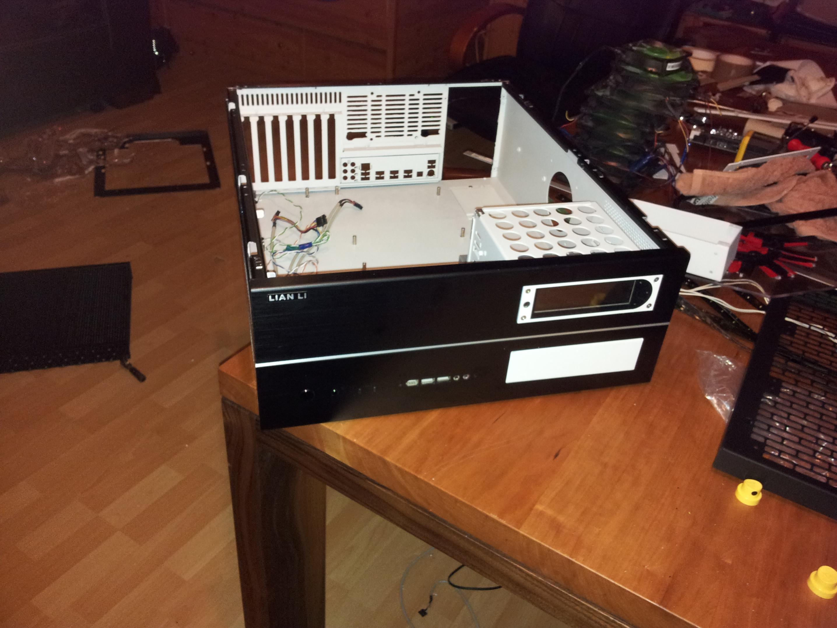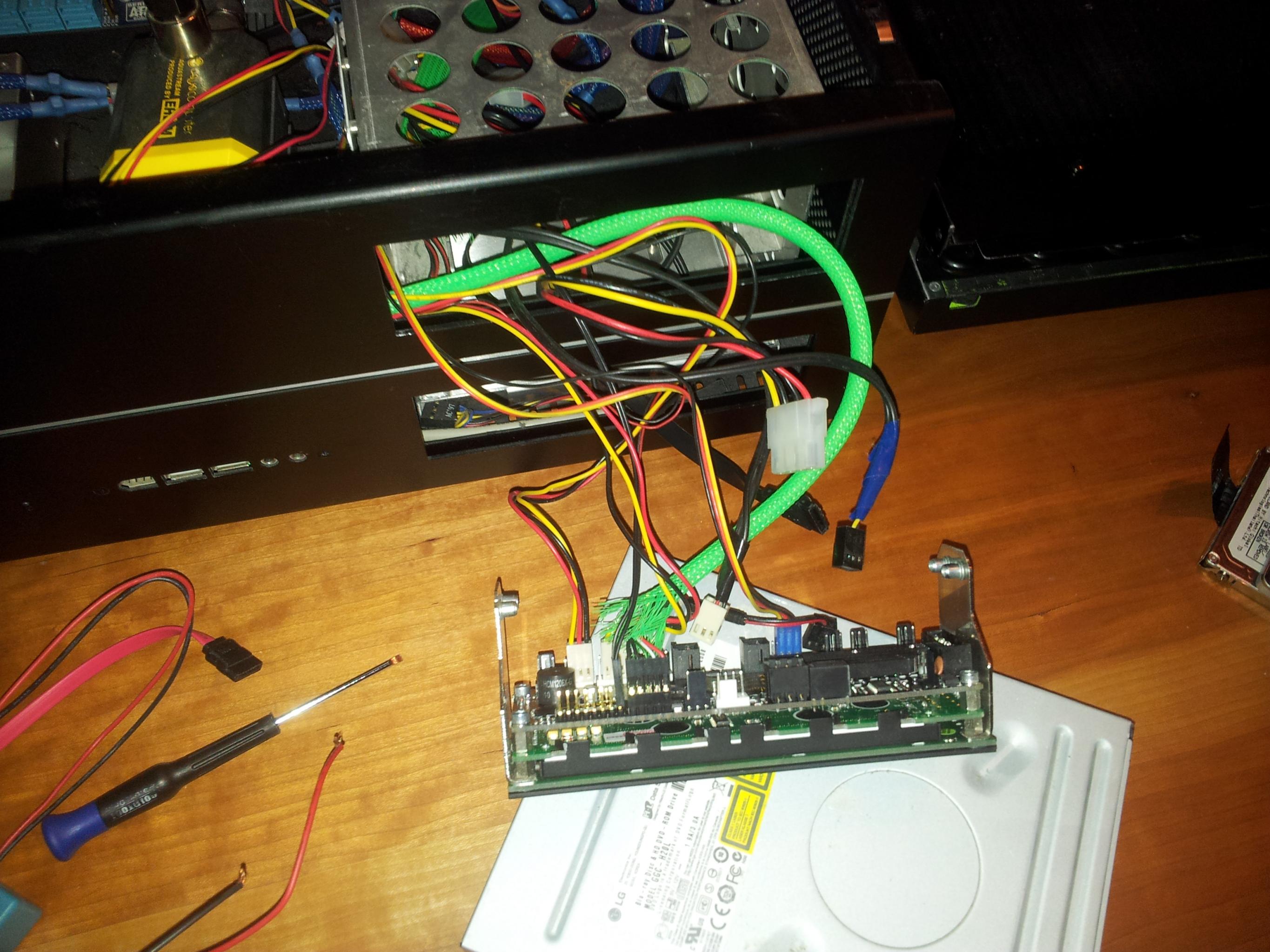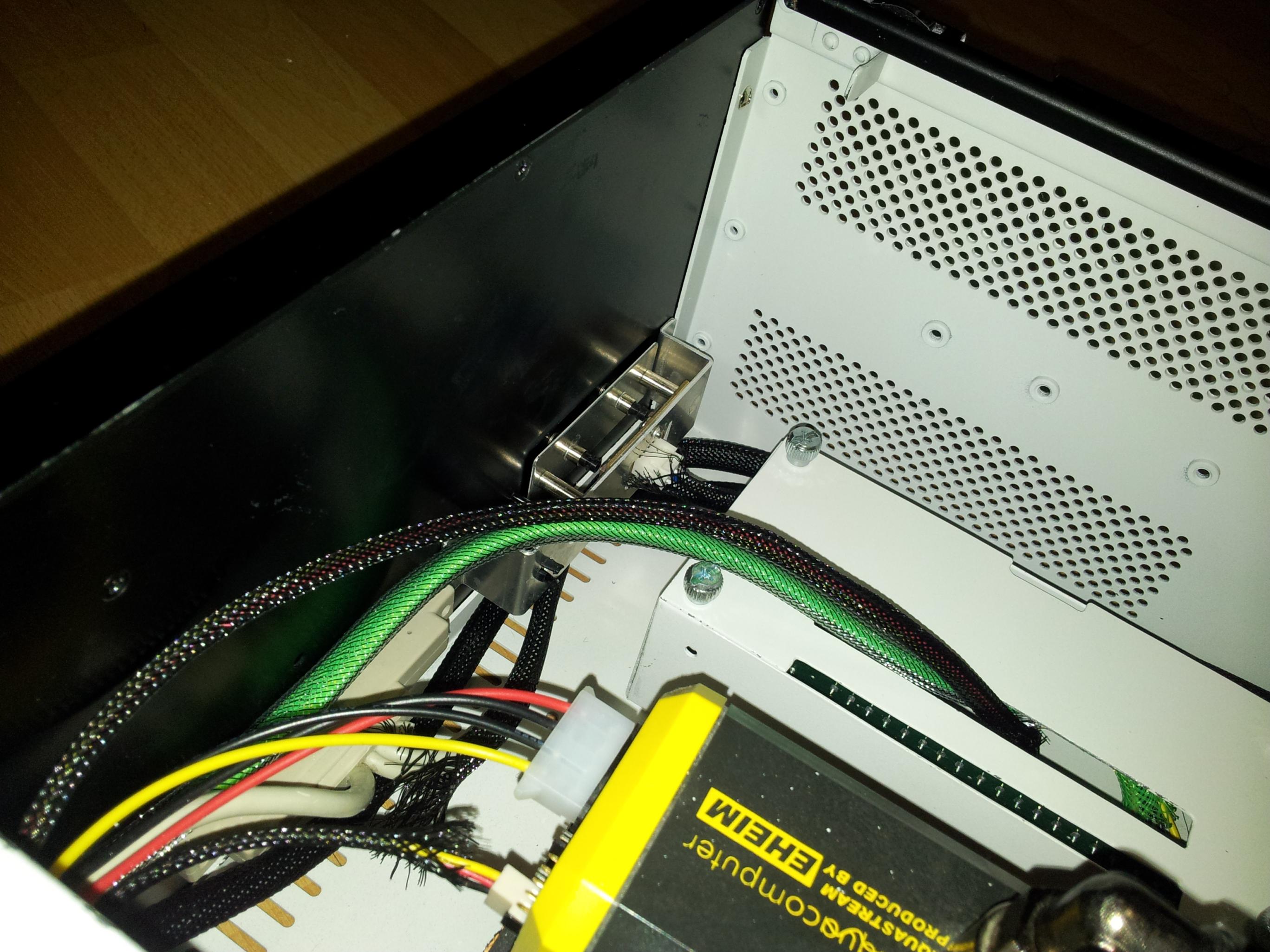 Das mit der klickbaren Frontblende war einfacher als gedacht: Ich hab einfach eine Aluschiene als Abstand mit Powerstrips an den ausfahrbaren Blu-Ray Schacht geklebt, und an die Frontblende ebenfalls per Powerstrip eine kleine Schraube geklebt. Die Frontblende sitzt mit den Powerstrips zwar fest, aber ist immernoch flexibel genug um mit geringer Kraft den Eject Schalter über die Frontblende zu betätigen. Ich bin echt mal gespannt wie gut das dann im Betrieb funktioniert ;-)