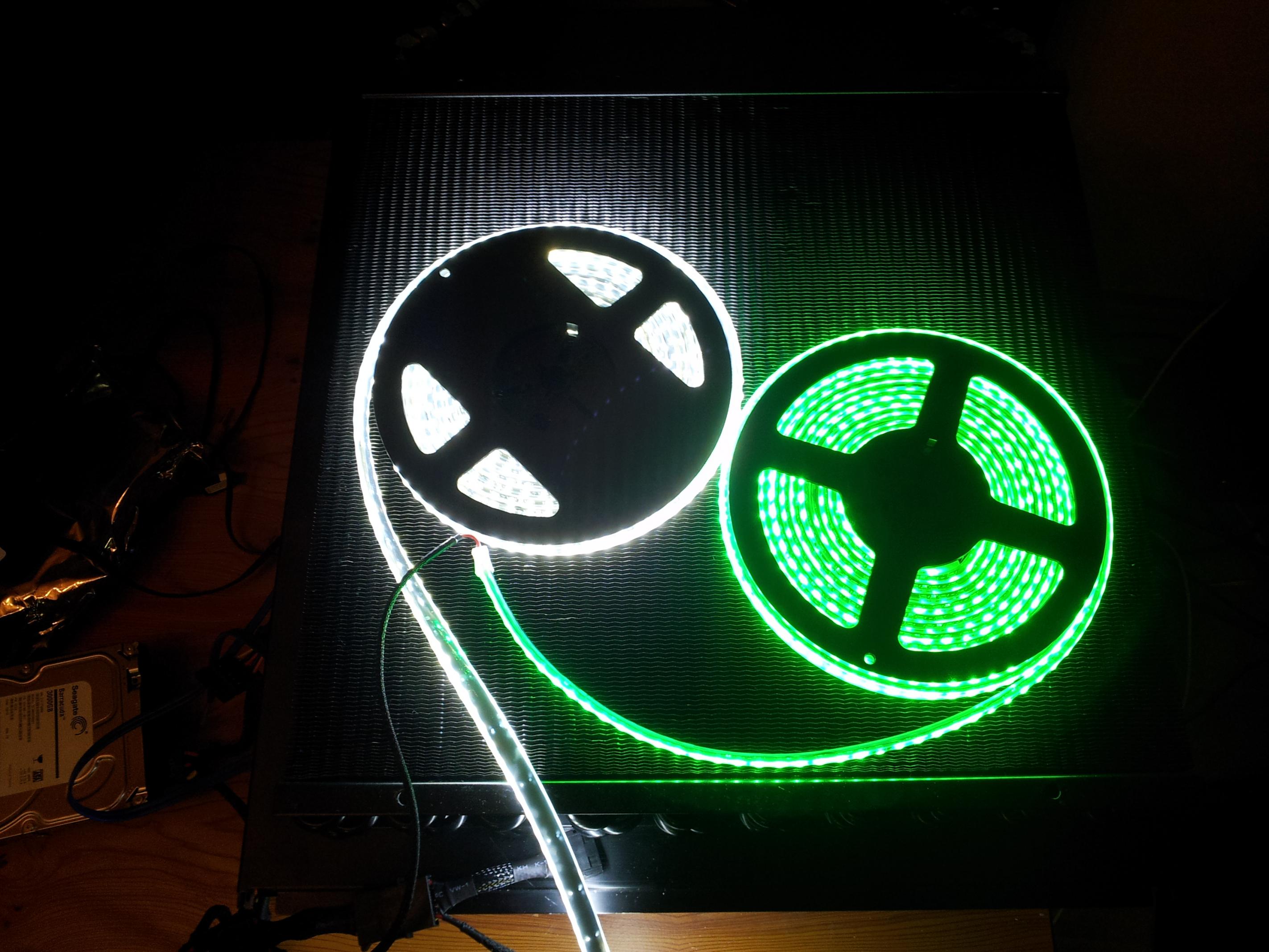 So, ich hab mal wieder groß eingekauft. Insbesondere die neuen High Density Flexlights von Phobya mit 600 LEDs auf 5m - in grün und in weiss: http://www.aquatuning.de/product_in...HighDensity-500cm-white--600x-SMD-LED-s-.html