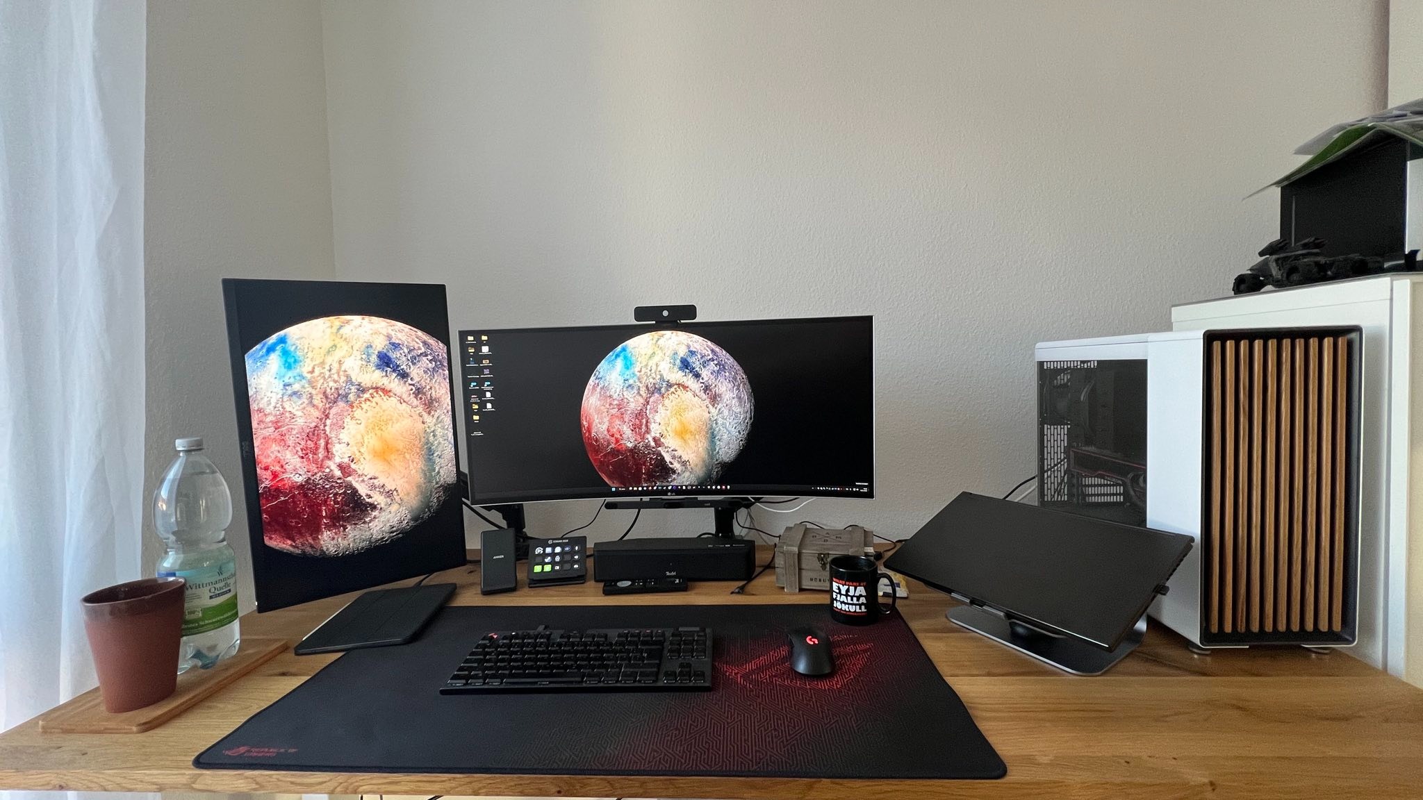 Ich habe am gaming pc einen 38 Zoll 3840 x 1600 Bildschirm mit 180hz und als zweit und dritt Bildschirm jeweils einen wqhd 165hz Bildschirm. Von der größe her bin ich zufrieden, hätte aber gerne Micro Led und 2160p+.