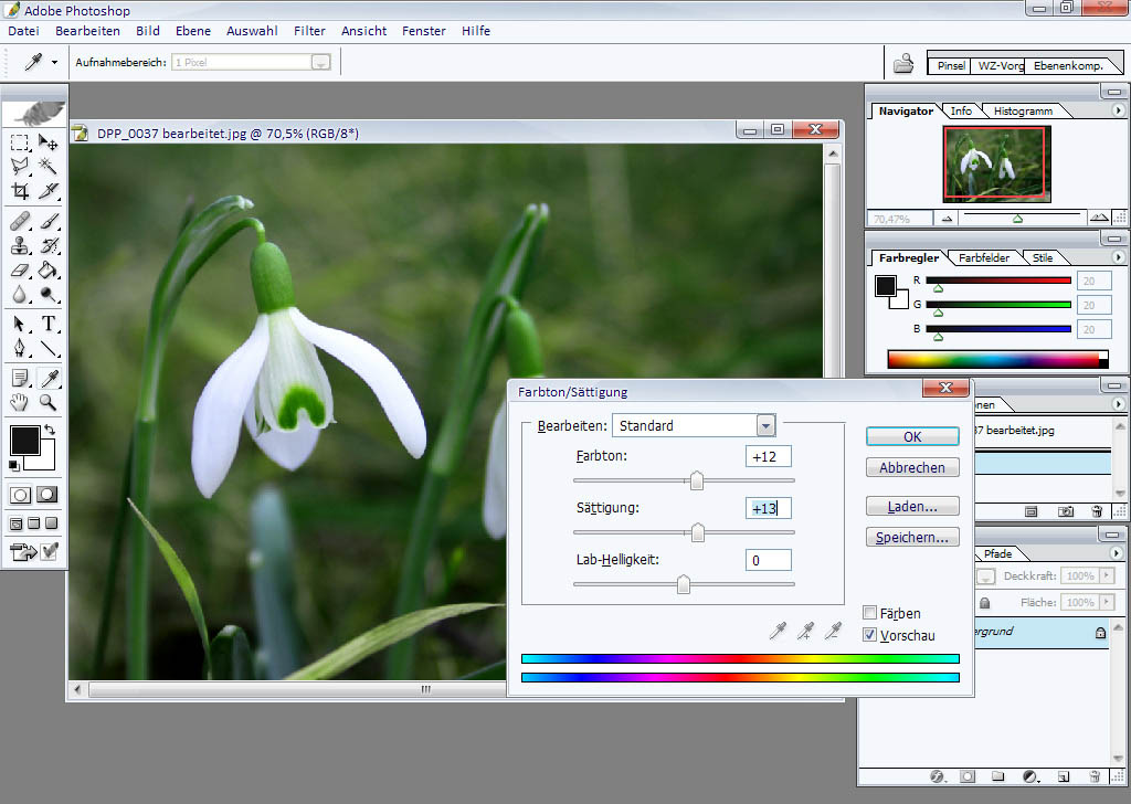 Naja wie dem auch sei, hab ich mich an das Bild mal rangemacht und noch ein bisschen mit PS gespielt. Das Ergebnis werde ich erst mit deiner Erlaubnis posten. Ja also mit den Kontrast warst du schonmal auf der richtigen Spur, allerdings hätte da noch ein bisschen mehr rein gekonnt. Die Helligkeit hab ich auch reduziert, damit der Grauschleier verschwindet. Damit das ganze etwas saftig grüner wirkt hab ich die Farben noch ein wenig verändert, also ein etwas mehr kräftigeres Grün und Sättigung angehoben.