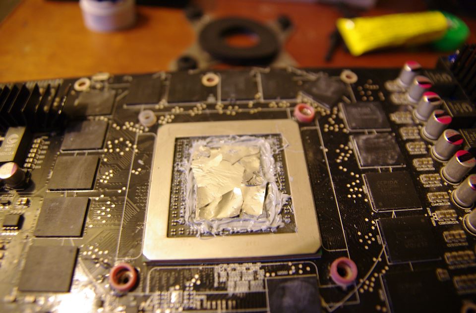 Chip : Hab da zum ersten mal WLP-Metall Pads (Collabory) verwendet. Aus Unwissenheit was passiert,wenn etwas davon vom Chip in den Zwischenraum des Rahmens läuft,eine ganze Wurst normale nl WLP um den Chip gezogen.Backplate/Kühler etwas anders verschraubt