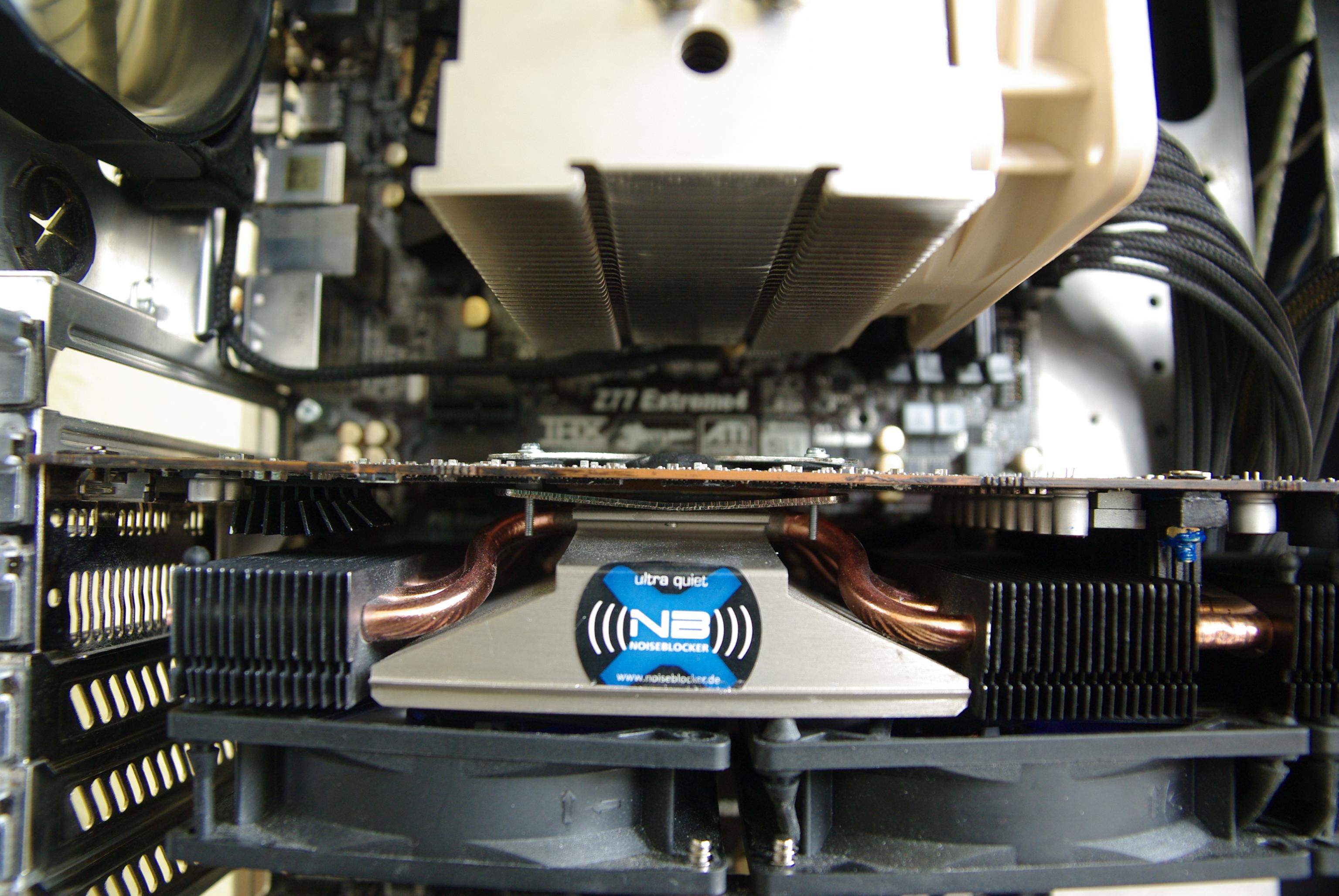Eine Kühlung der Speicherchips haben wir nicht vorgenommen. Schon seit Jahren wiederholen wir uns an diesem Punkt, dass die Speicherkühlung bei Referenzkarten eben nur wegen des verkapselten Kühlerkonstrukts nötig wird, welches keine Belüftung der Chips erlaubt. In vorliegendem Falle hat man es allerdings mit einem offenen Kühlerkonstrukt zu tun, bei welchem der Speicher auch noch direkt mit Abluft der Ventilatoren befächert wird und dabei nicht an die Grenzen seiner Temperaturlimits gelangt.