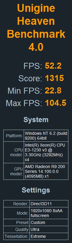 Lass Heaven erst ein mal komplett durchlaufen bevor du den Bench startest sonst hast du wie oben miese min FPS. Heaven steht profitiert übrigens nochmal gut von VRAM OC.