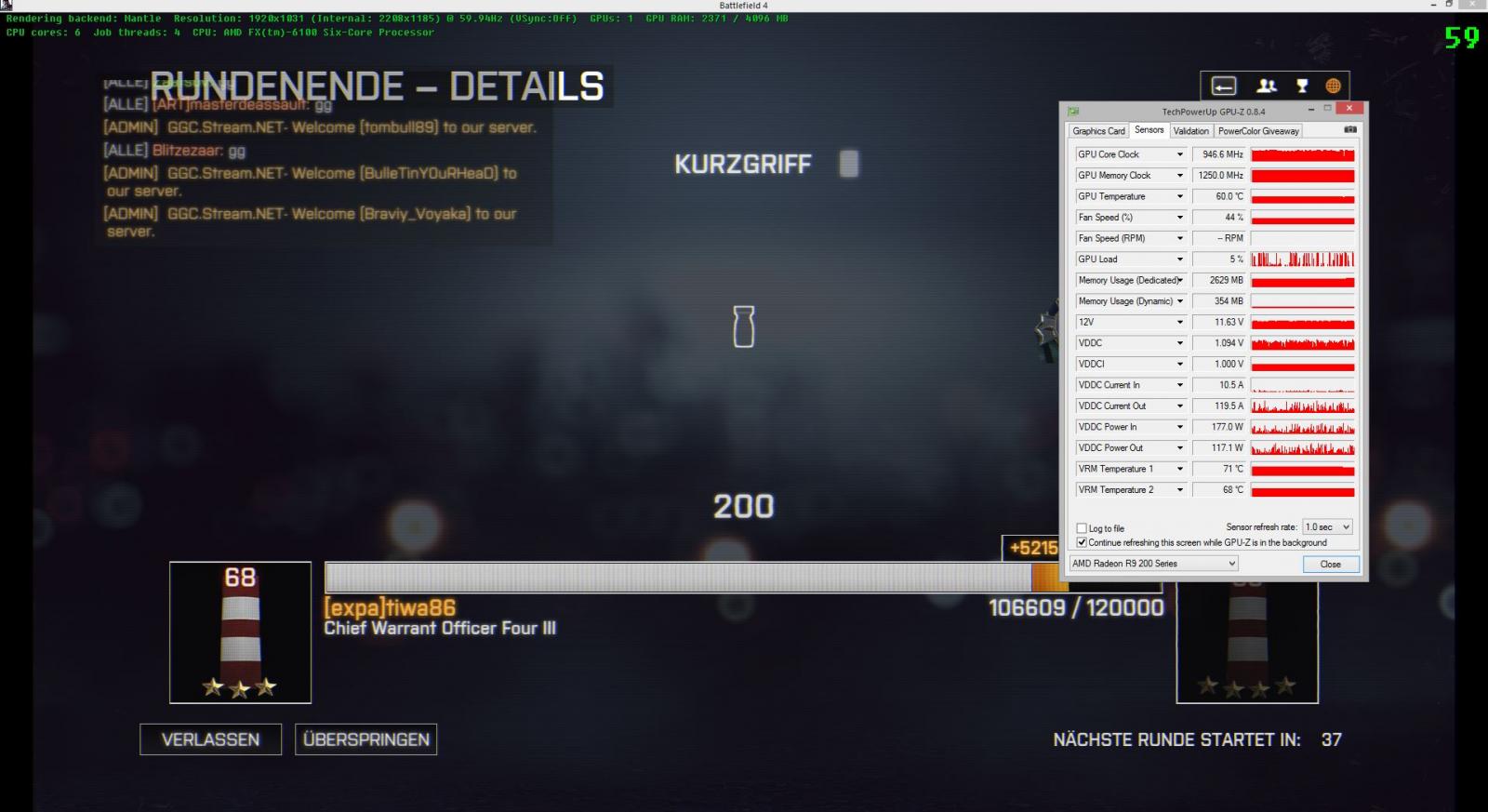 So, meine 290 OC mit 1050/1250 hat jetzt in BF4 auch endlich gute Temp-Werte (Morpheus @ 7V quasi lautlos). Hier sind die VRM1 auch am wärmsten. FPS hab ich auf feste 59 limitiert, das kommt der Karte und dem Spielgefühl zugute. Auflösung ist auf ca. 2208x1185 hochskaliert (Resolution Scaling). Hab dadurch scharfe kanten, aber kaum Performanceverlust, weil jetzt endlich auch die Karte mal ihr Potenzial ausschöpfen kann. Dafür musste aber mein Bottleneck, der FX-6100 auf 4 Ghz übertaktet werden - passierte hier aber ohne Spannungserhöhung. Daher Win/Win Situation.