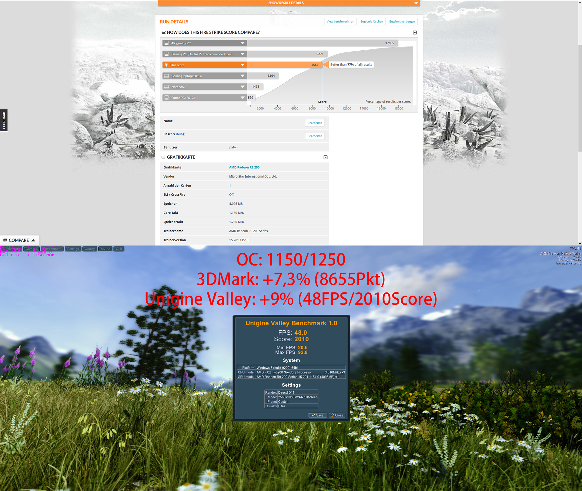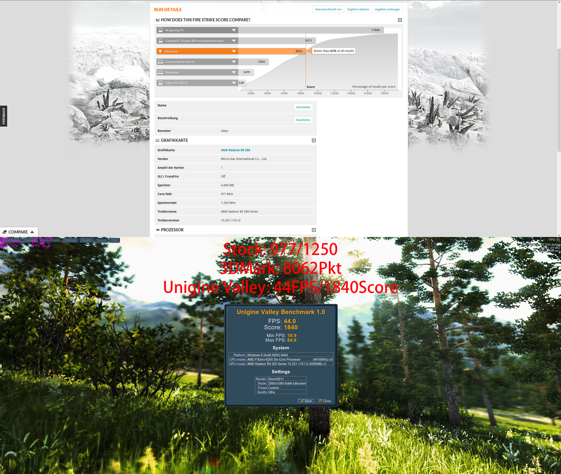 So.... heute war es soweit.... ich habe meinen Kühlkörper von EK Water Block bekommen. Zum Kühlkörper muss ich sagen, dass es das wohl schlechteste war, was ich seit langer Zeit an Komponenten bekommen habe. Das einzig Gute an dem Kühlkörper ist die Leistung. Im Stock-Last Bereich liege ich bei maximalen 49°C und im OC-Last-Bereich liege ich bei 54°C. Mit Luft waren vorher Temperaturen von 75°C - 80°C völlig normal. Leider gibt der Chip bei meiner MSI R9 290 Gaming 4G nicht so viel her, wie temperaturtechnisch drin wäre. Ich habe das ganze einmal in ein paar Bildern festgehalten. Im Wesentlichem bestand die Übertaktung in der Core-Frequenz, die von 977MHz auf 1150MHz zu kriegen war. Mehr war ohne merkliche Grafikfehler nicht drin. Ich habe dazu mal zwei rein synthetische Benchmarks laufen lassen. Der Rest sollte sich von selbst erklären. (Die Größe der Screenshots habe ich zur besseren Einsicht größentechnisch etwas angepasst.)