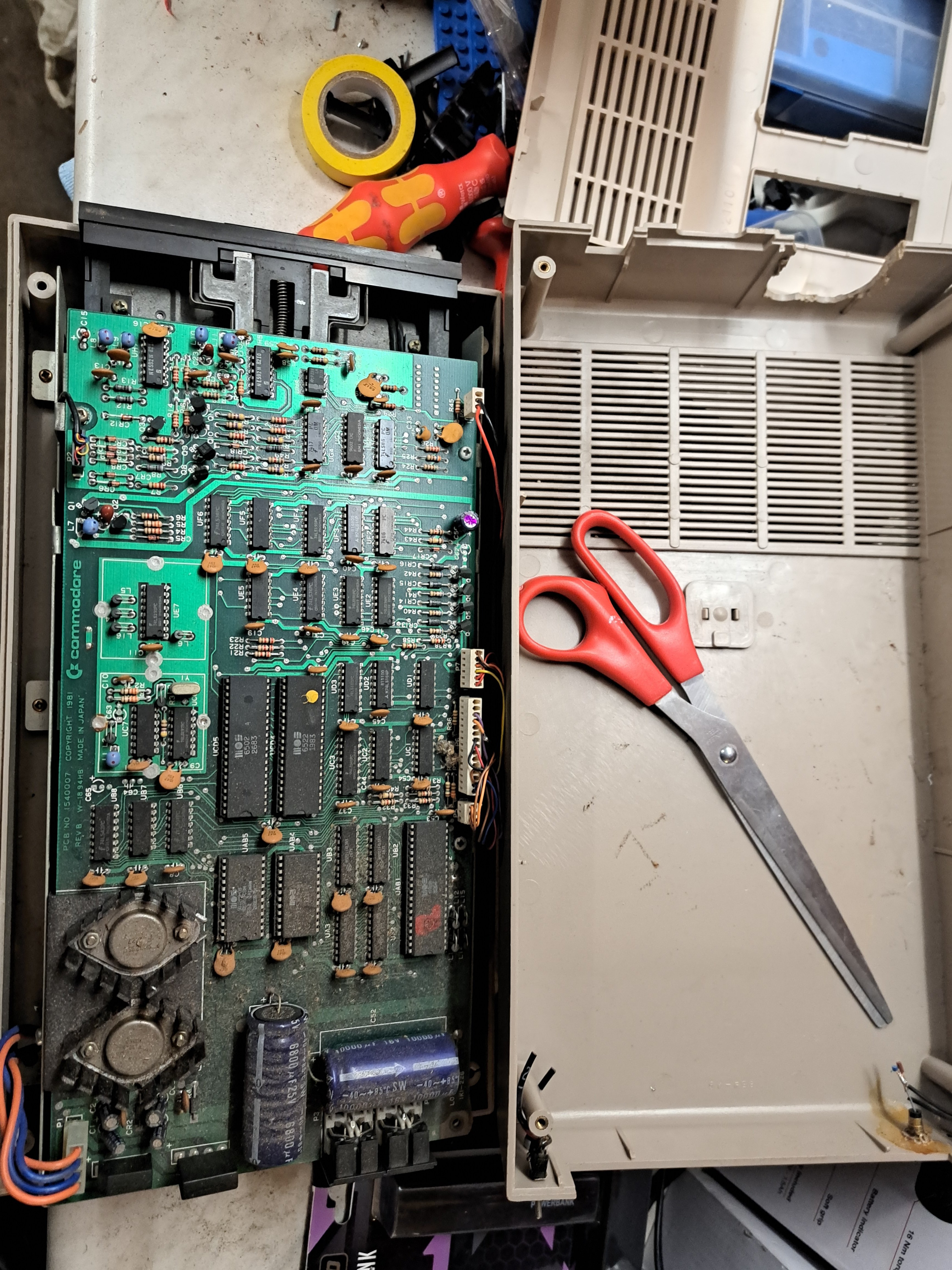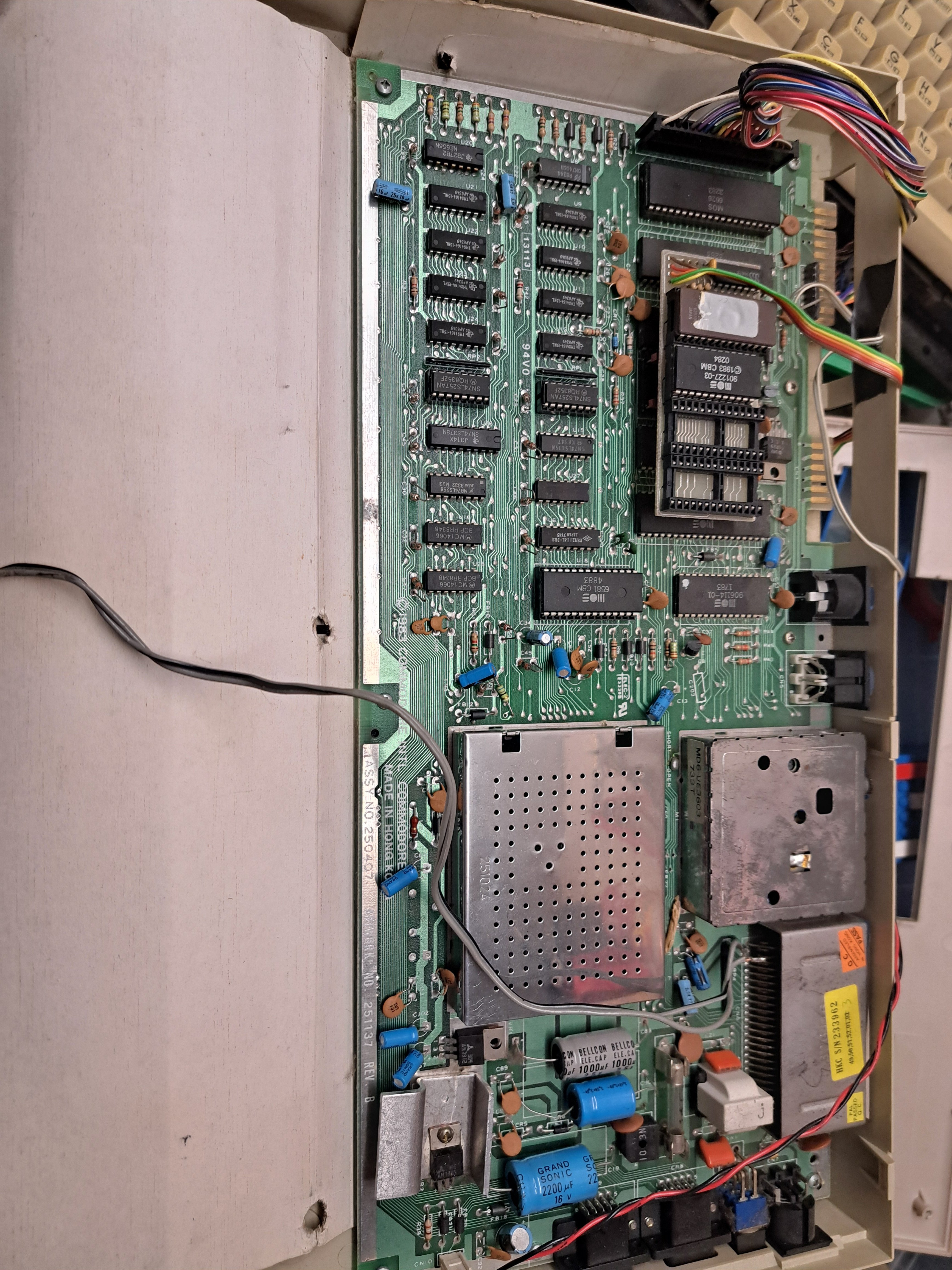 Im c64 selbst steckt eine 407 platine- welche sonst nur im Brotkasten zu finden war - deswegen war die Tastatur auch nicht richtig befestigt - was dafür spricht, dass vorher eine 469 verbaut war.