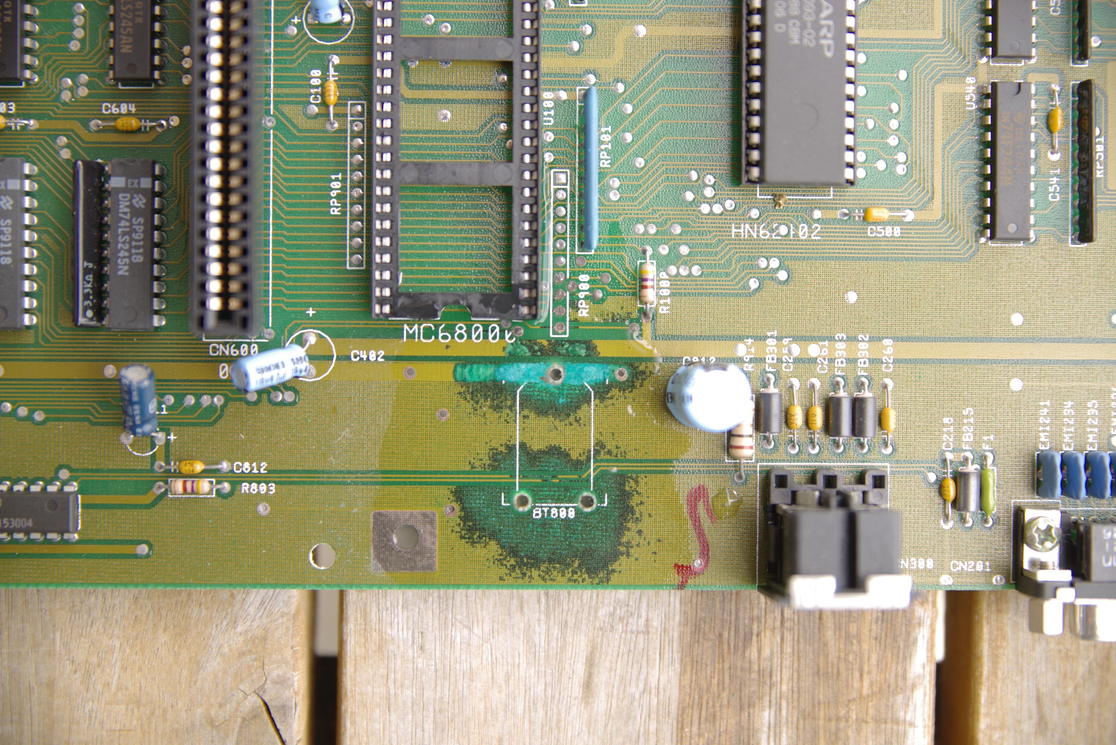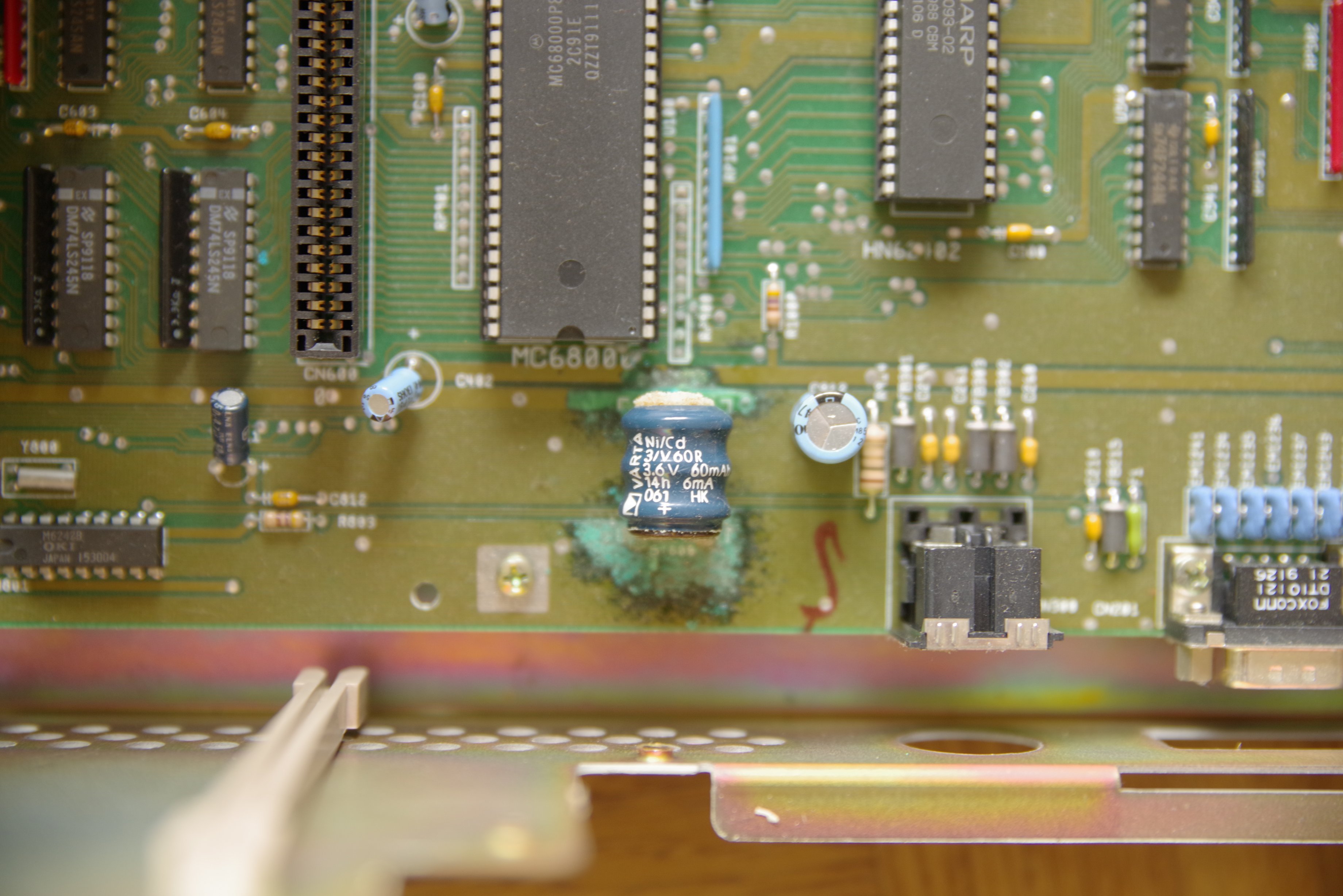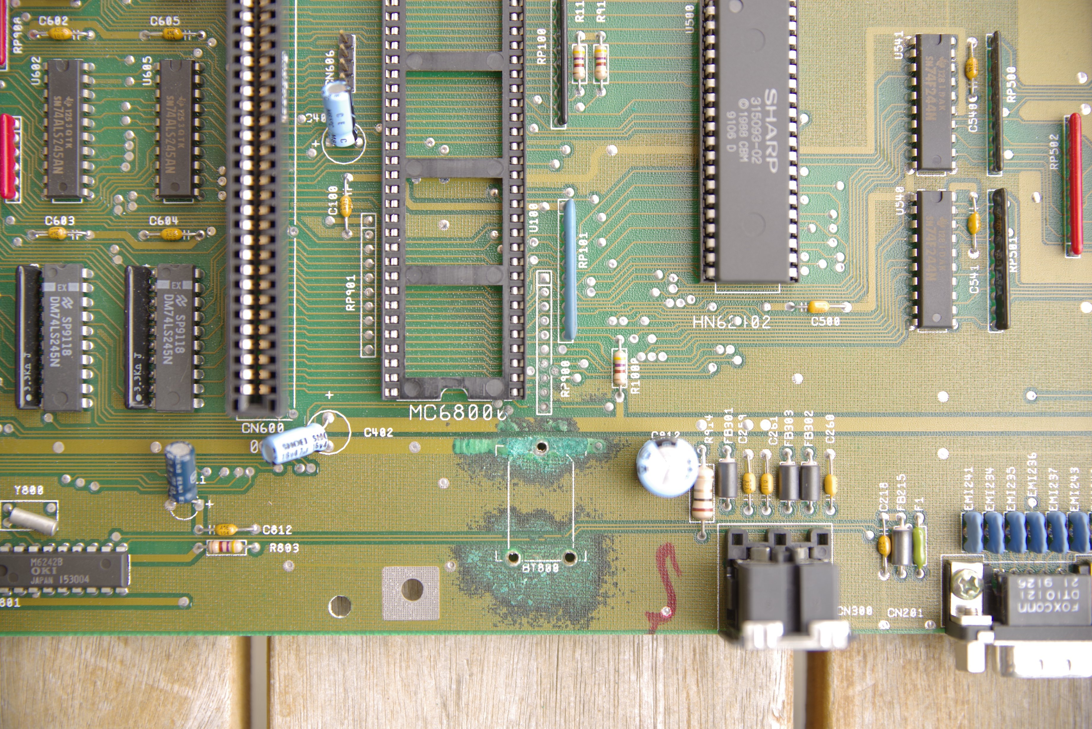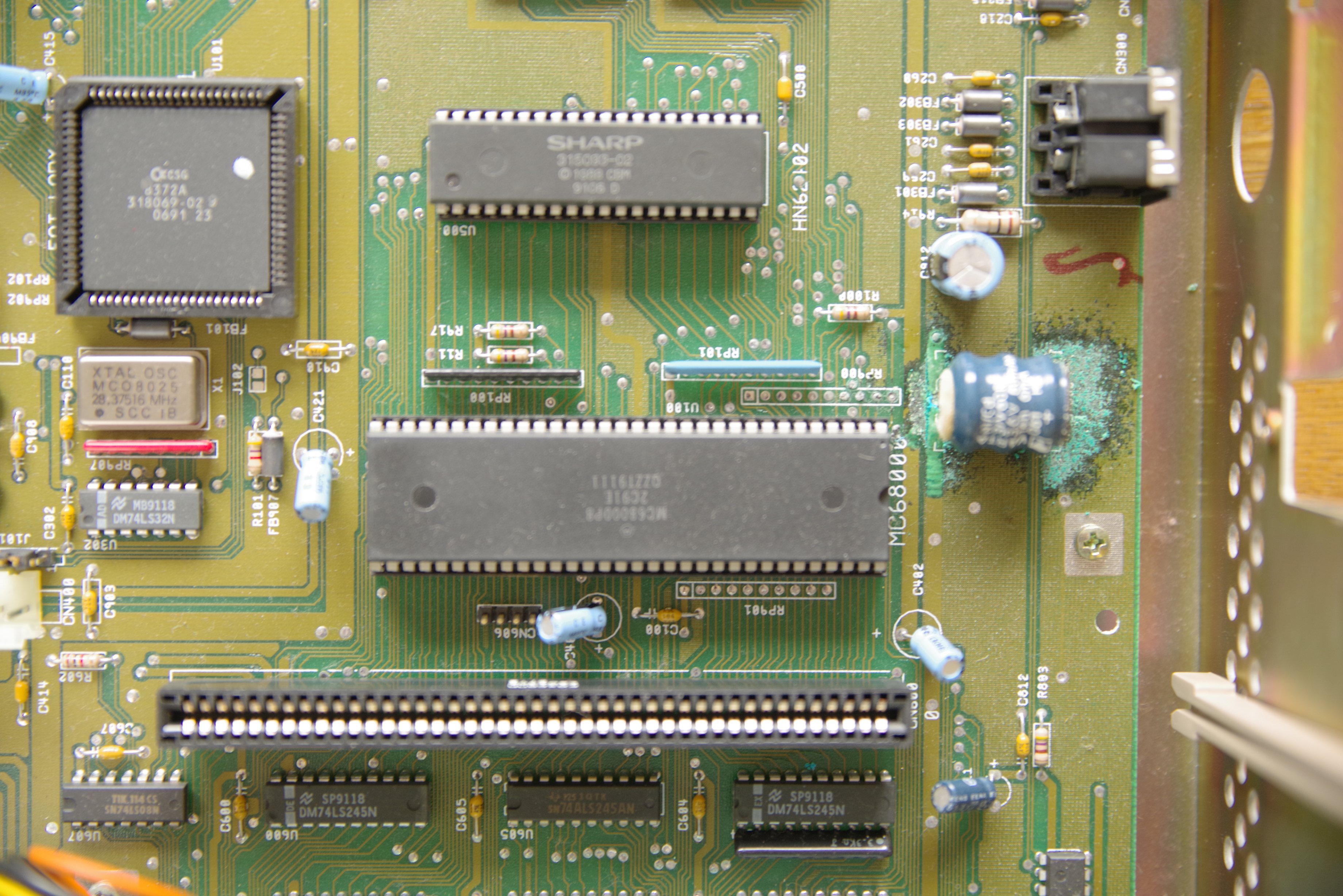 Also lieber heute als morgen auslöten, oder mindestens mit dem Seitenschneider abklemmen und entfernen! Bis dahin, den Amiga mit erhöhtem Heck lagern. So würde sich die auslaufende Lauge nicht auf der Hauptplatine verteilen…