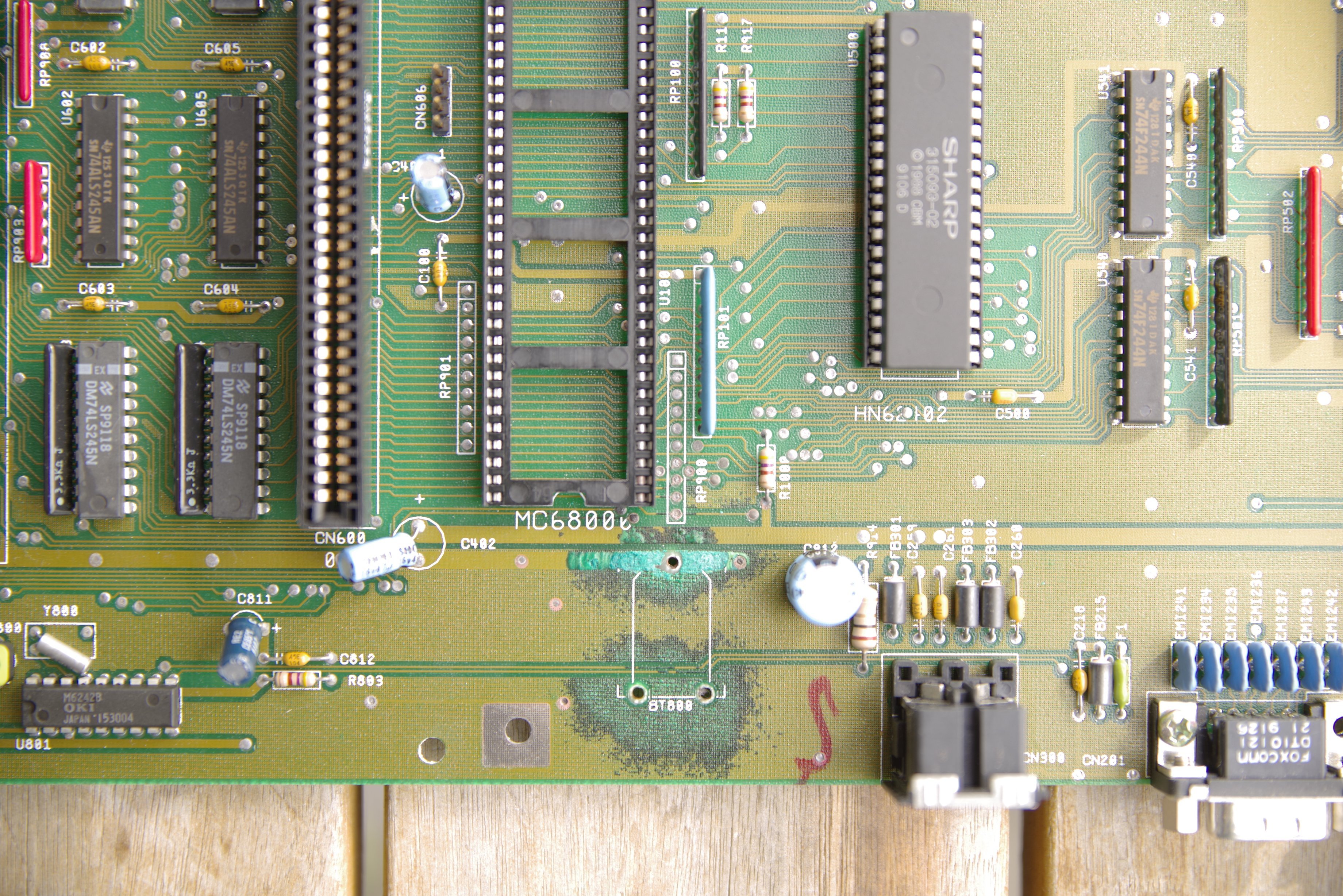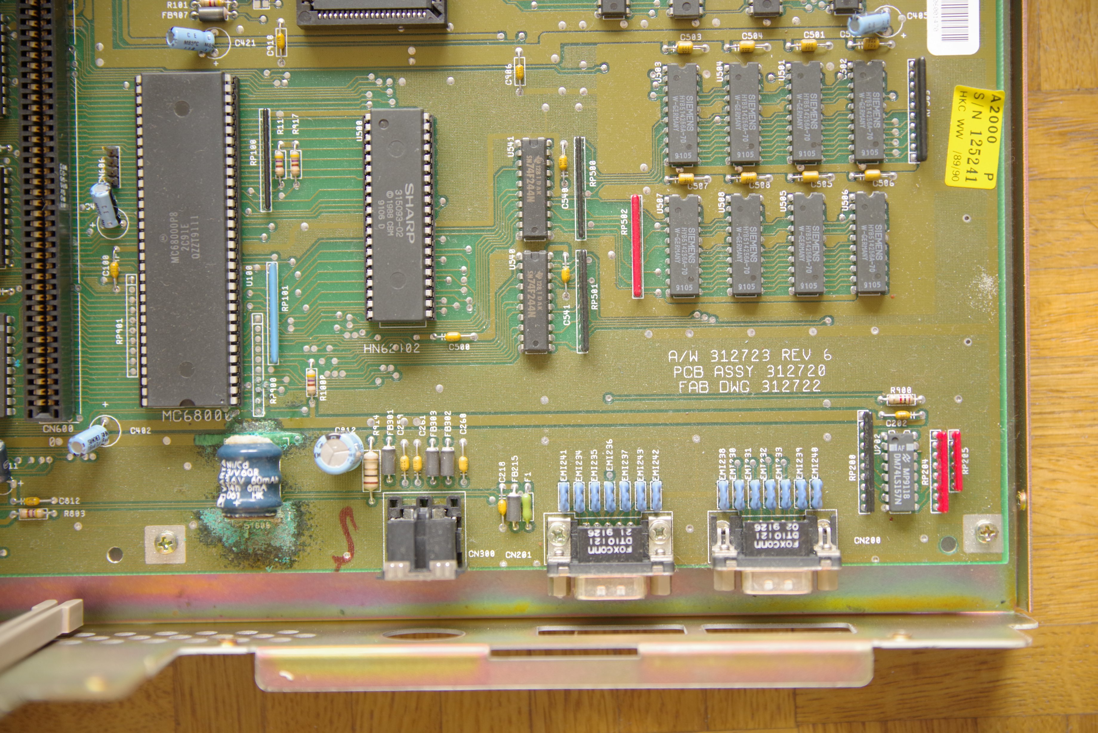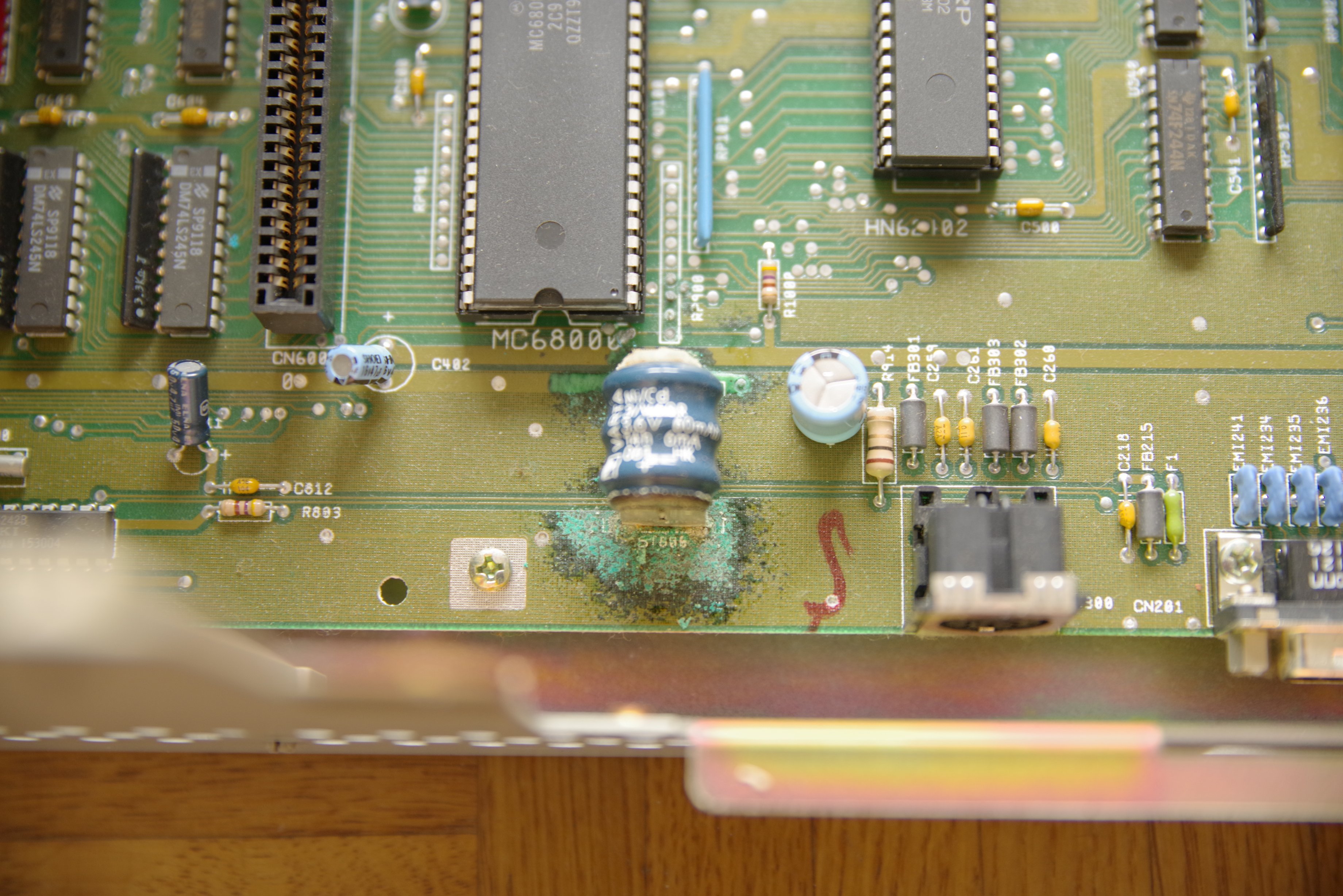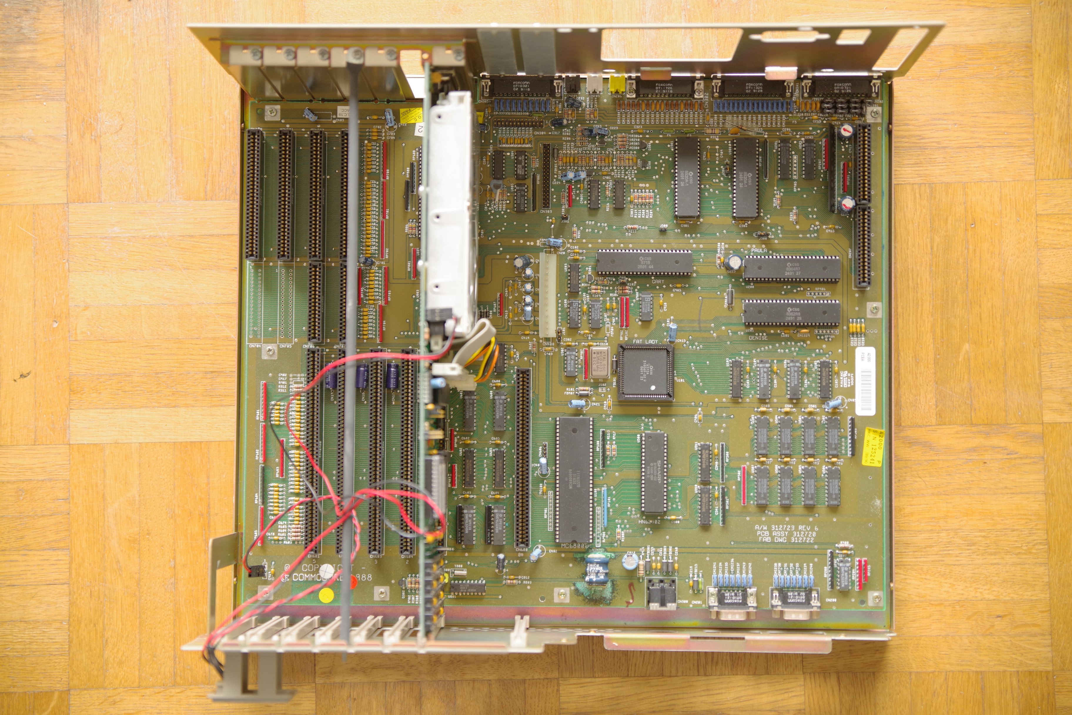 Also lieber heute als morgen auslöten, oder mindestens mit dem Seitenschneider abklemmen und entfernen! Bis dahin, den Amiga mit erhöhtem Heck lagern. So würde sich die auslaufende Lauge nicht auf der Hauptplatine verteilen…