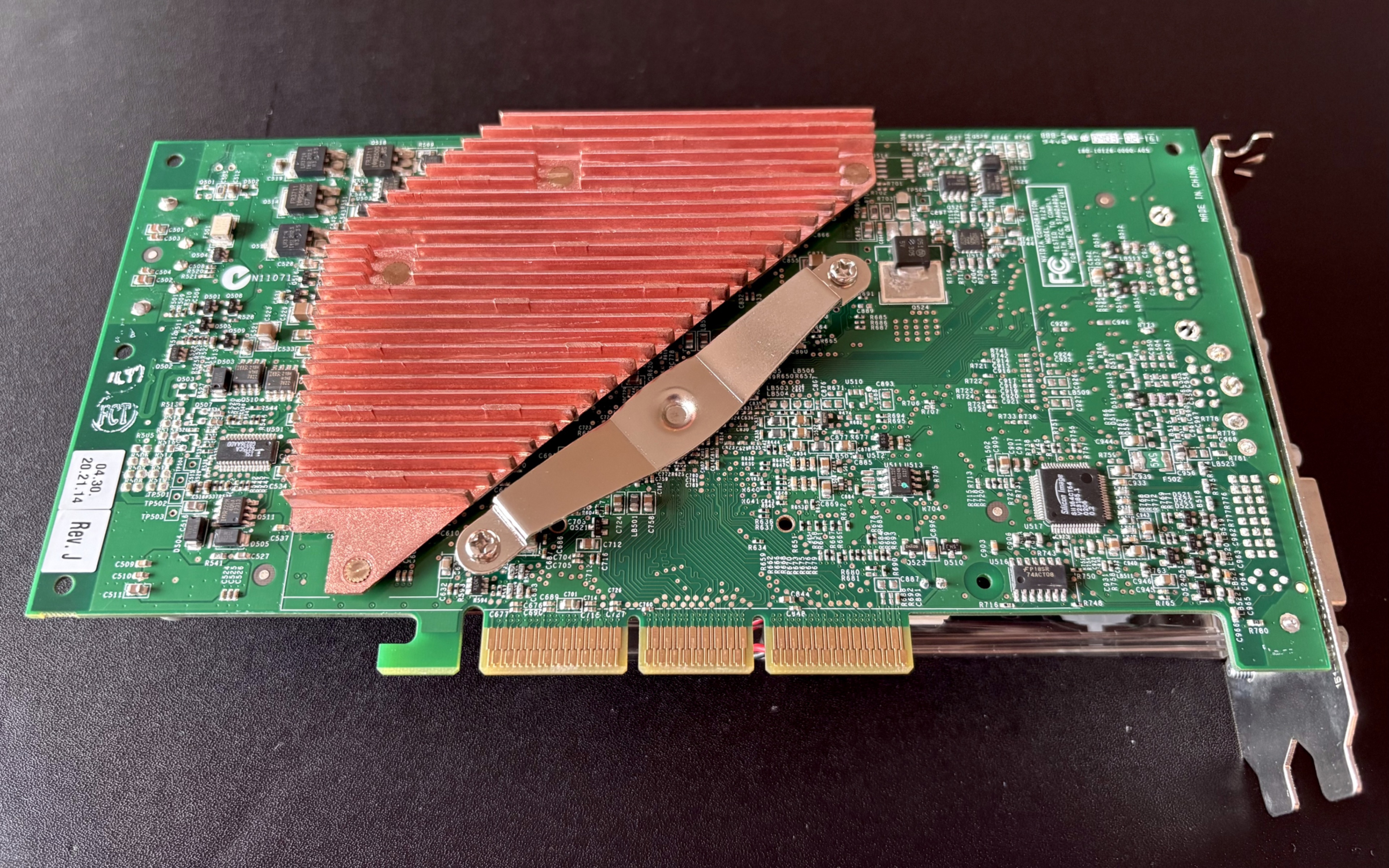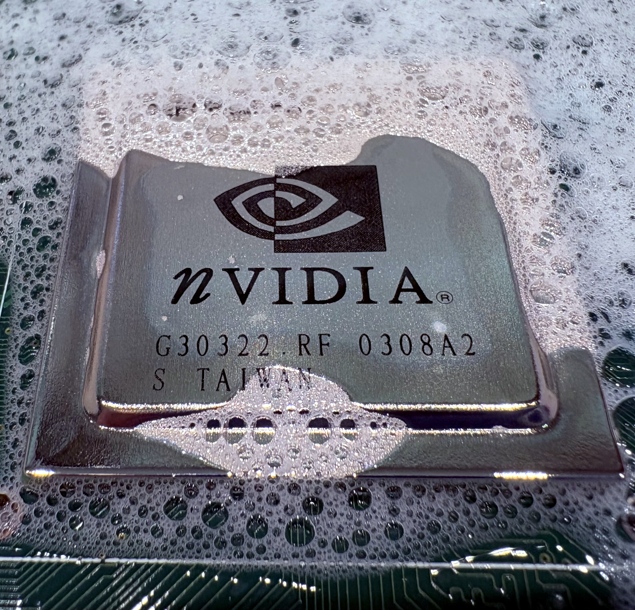 Dass einer der Vorbesitzer keine Ahnung hatte, sieht man auch an der Rückseite. Da hat ein Lötkolben leider bleibende Spuren an dem Schutzlack hinterlassen, sodass man auf die Glasfaser-Struktur gucken kann. Zum Glück sind keine Leiterbahnen oder darunterliegende Schichten beschädigt.