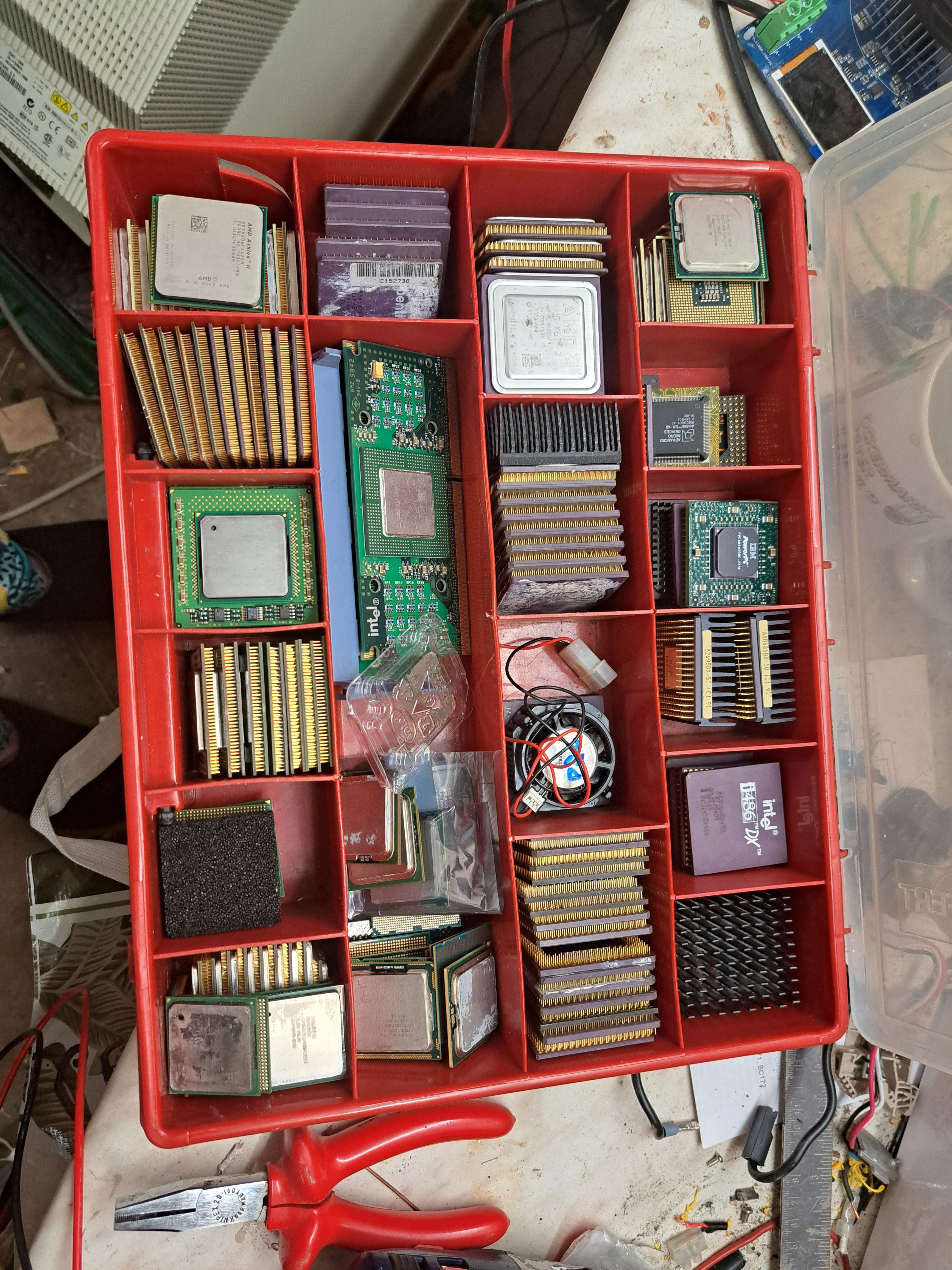 RAM und CPUs könnte ich auch problemlos in Kilo aufwiegen ^^ Um die 300 CPUs müssten sich hier befinden (leider nur etwas über 200 in der Liste, die schon Jahre alt ist) und RAM ... ohje, kann ich echt nicht mehr zählen. Aber von EDO bzw. PS2-Modulen bis hin zu DDR3 ist alles im Fundus (DDR4 und DDR5 sind lediglich in meinen Hauptsystemen verbaut).