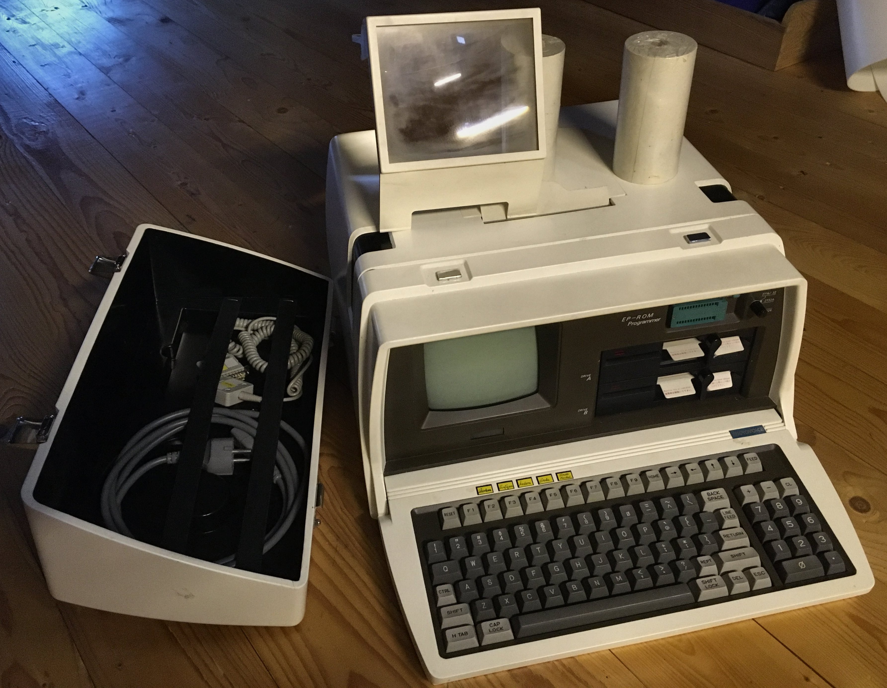 Hier noch was ganz besonderes...eine Microvoice Formula 1 - ein tragbarer Computer mit eigebautem Röhrenmonitor (grün), zwei 5 1/4 " Diskettenlauferwerken, EPROM-Brenner und Thermodrucker, hinten befindet sich u.a. ein Anschluss für eine 8 " Floppy. Außerdem gibt es eine Aufsatz-Lupe für den Monitor. Achja...auf dem Koffer läuft