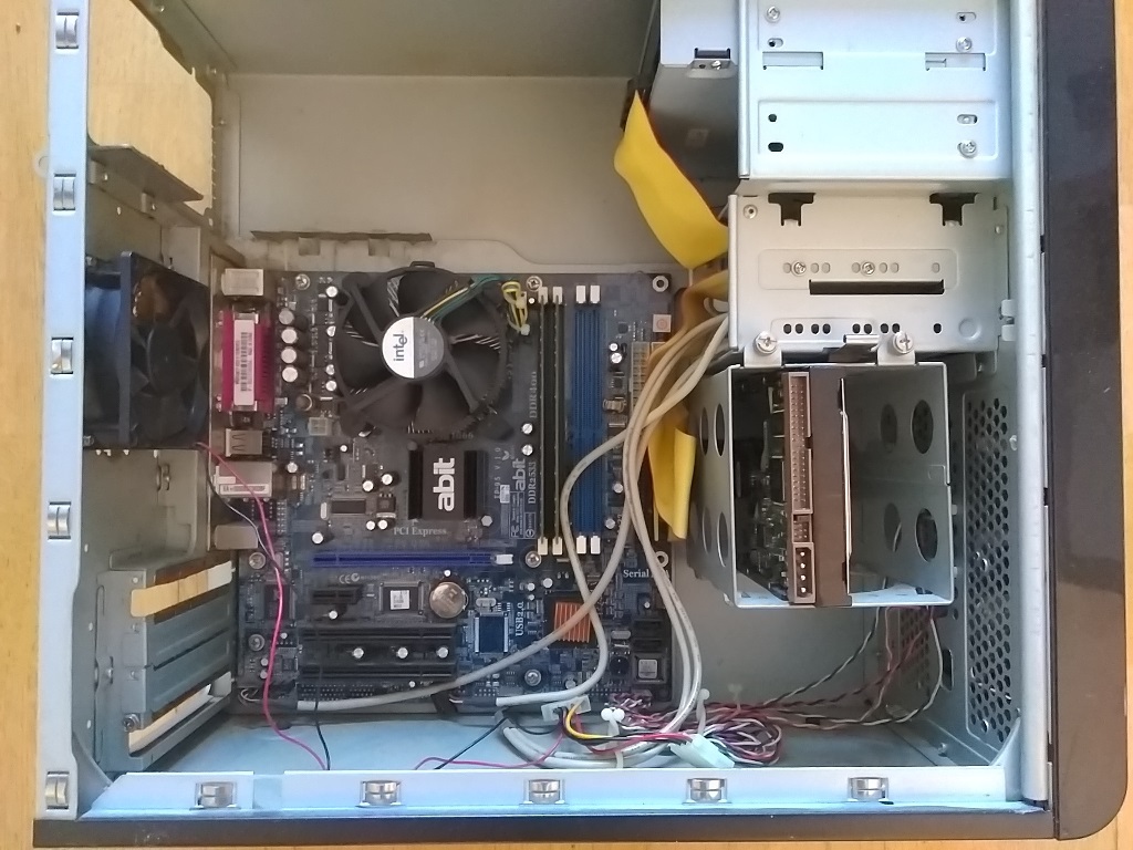 Mein neustes Projekt. Ist der Rechner von meinem Schwager. Ursprünglich war ein MSI Board mit Celeron D und einer FX5200 drin. Dann starb das Board an ungeklärter Ursache und wir kauften für nen schmalen Taler das Abit IP-95 und eine GF7300GT. Den Celeron wollte er behalten obwohl ich ihm einen Core2 empfohlen habe. Lange ist es her und das Ding ist nun bei mir. Da die Büchse permanent zugequalmt wurde, waren die Einschübe vom Kartenleser und auch die Lamellen des boxed Kühler komplett dicht. Selbst nach 15min staubsaugen, ist der Kasten nicht komplett staubfrei.