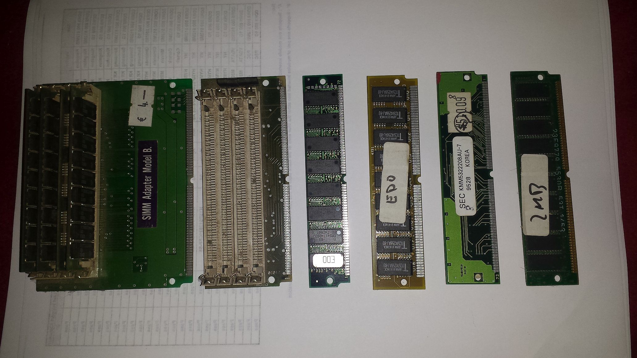 Um die Simm mit neueren Boards weiter verwenden zu können gab es Adapter. Die Speicher mit der Kerbe in der Mitte (alt wie ein Stein) gab es als EDO und fast page. Manche Boards liefen nur mit EDO Speichern, andere nur mit fast page.
