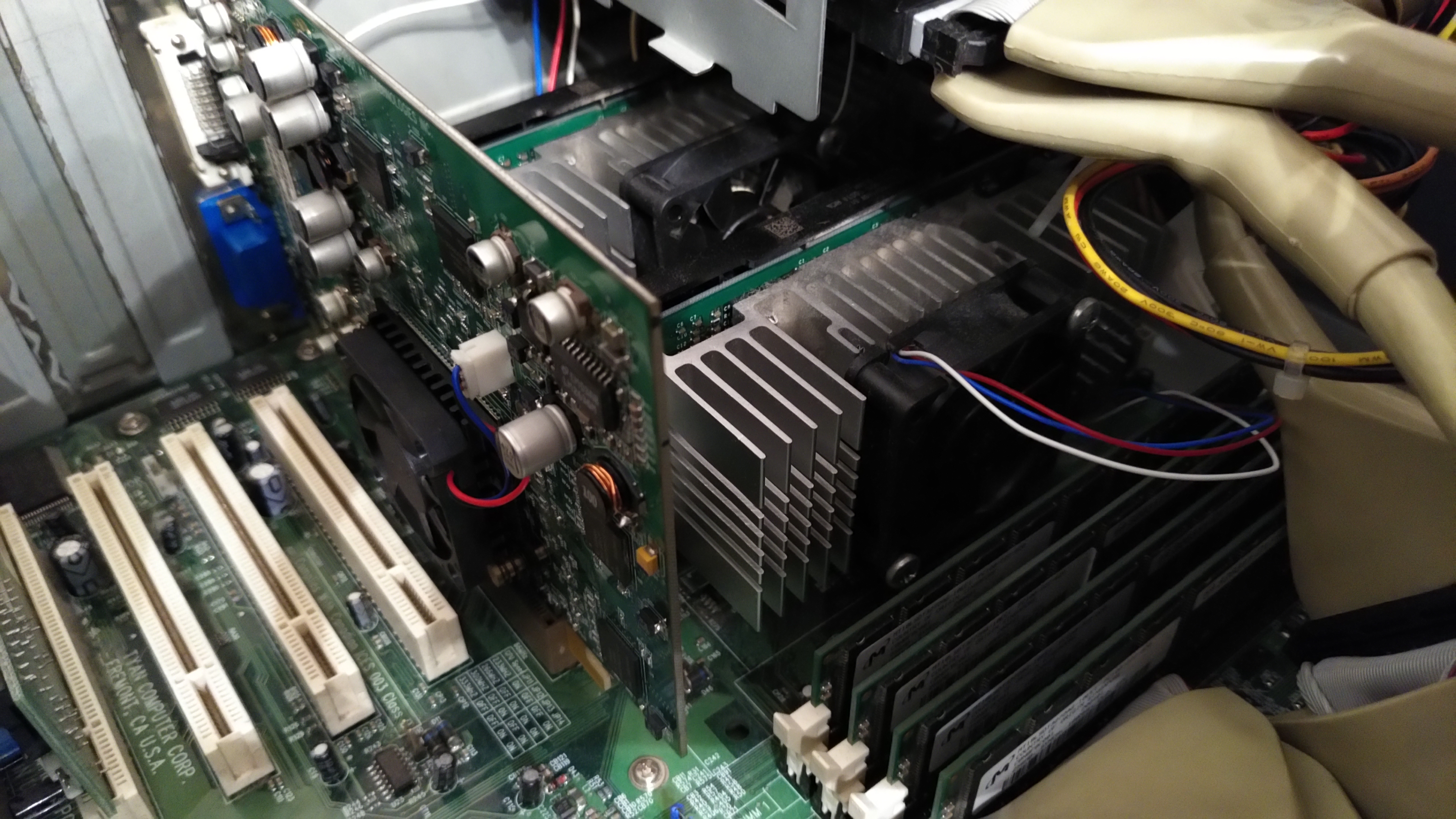Das Board ist eine Tyan Tiger 100 mit zwei mal Pentium 3 700MHz, das bisher ohne ECC auskommen musste. Gibt später noch mehr Bilder von der Kiste, jetzt wird erst mal die GPU getauscht (Diamond FireGL 1000 raus und die ATI FireGL 8800 rein) HDDs gecheckt und dann ein Windows 2000 installiert ;-)