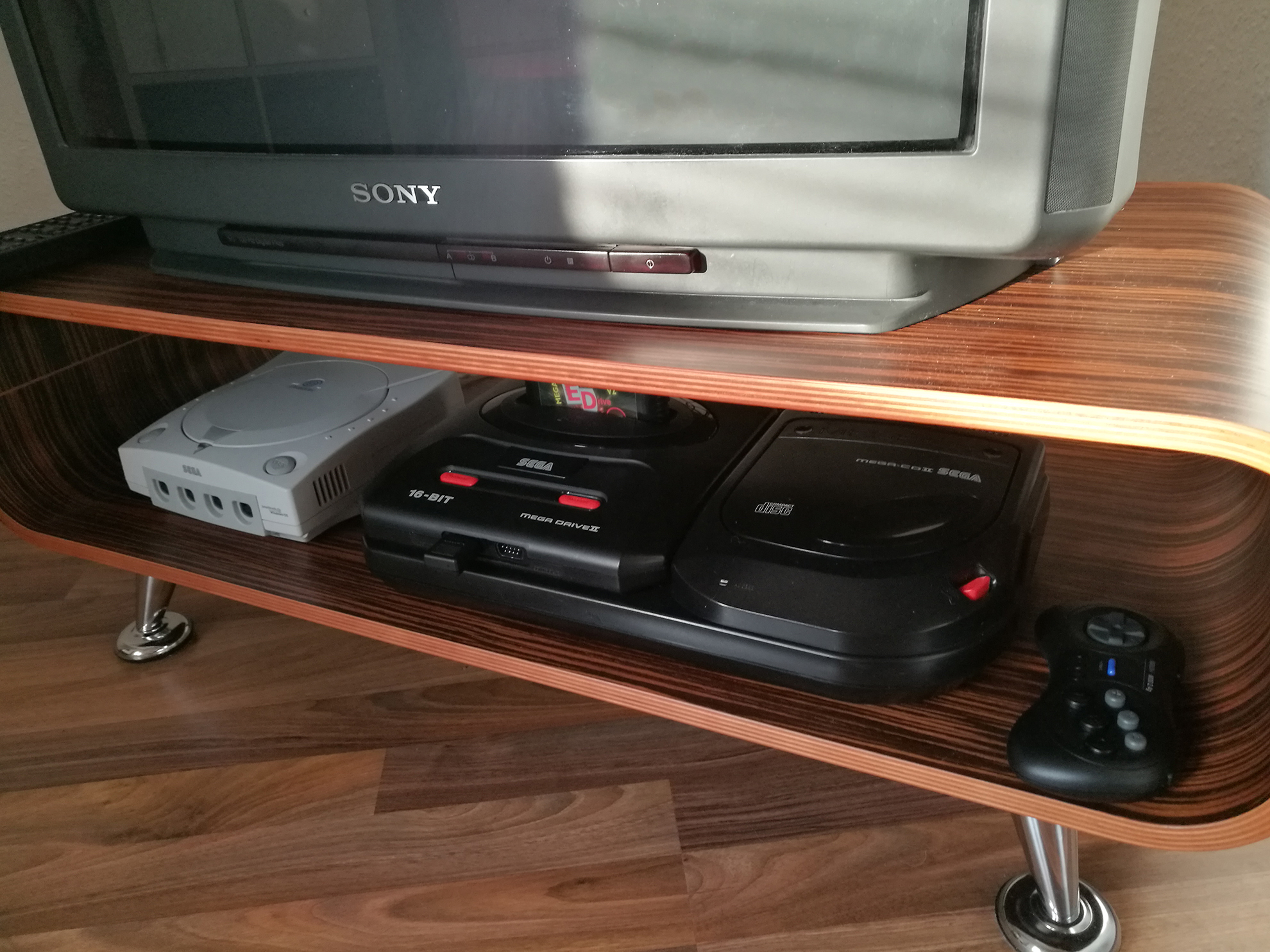 Das Mega Drive hat mittlerweile den "Drive" im Namen verdient (Mega CD2, repariert, gereinigt, recapped, Eprom für den zum switchless Mod des Mega Drives passenden Bios-Mod (Regionumschalter+60Hz Schalter ohne das Gehäuse zerstören zu müssen) liegt schon da. Mega Drive und Mega CD laufen an einem neu gebauten Netzteil auf Basis des Greisis-Workbench-PCB-Designs für C64/1541. Passend dazu die Sony Trinitron Röhre (bislang nur gebaded) und mittlerweile auch ein 8BitDo M30 2.4 Gamepad und ein Everdrive. Dazu kommt noch der Umbau meines original (japanischen) 6Buttons Pads zum Wireless Pad. Daneben meine DreamCast, recapped mit FanMod und GDEmu. Die wartet hier noch auf die Ankunft des DCHDMI, wandert dann sicher an den 4K neben den Atari VCS und macht somit Platz für... evtl. einen Saturn?