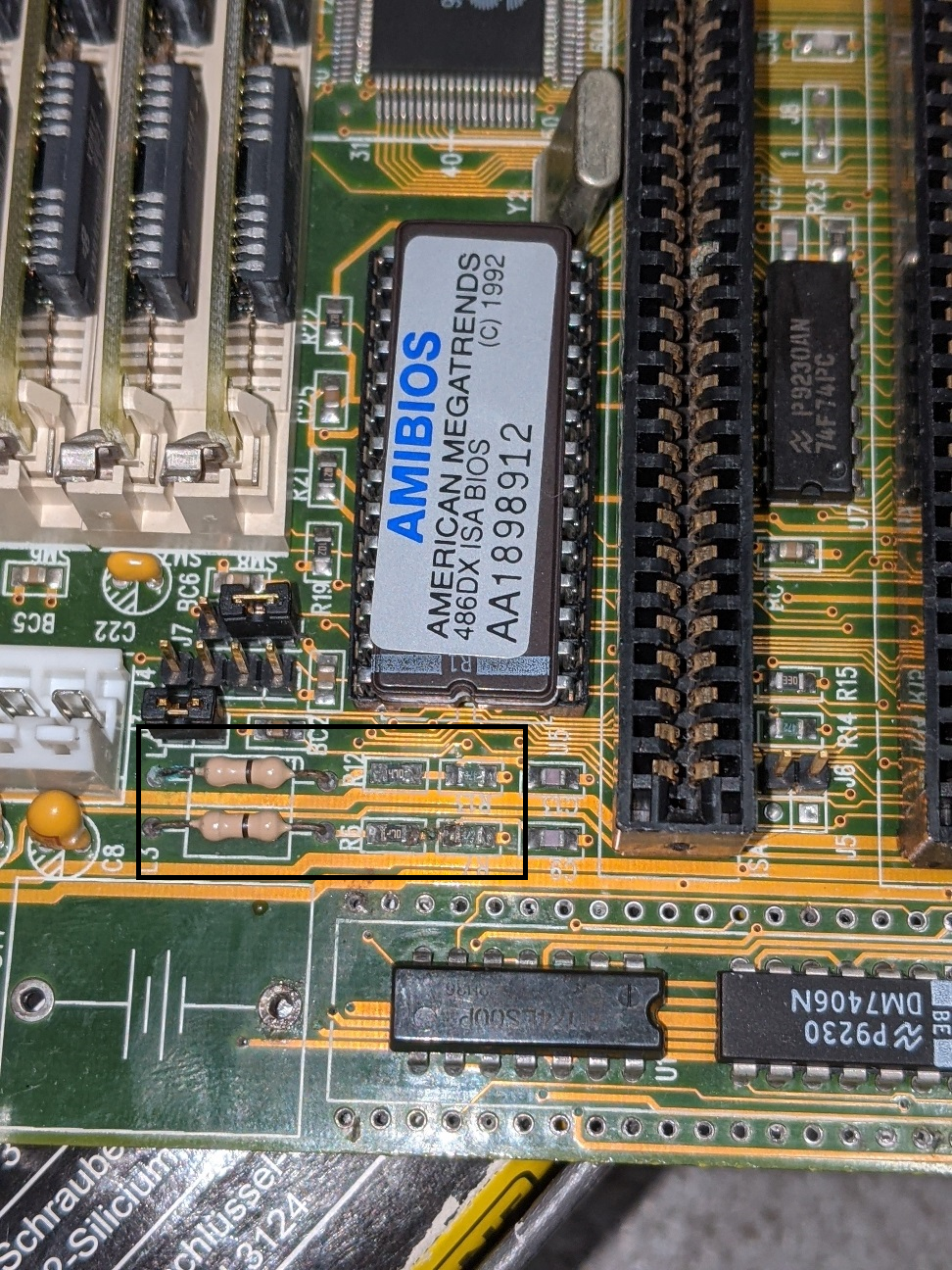 Heute muss ich zuerst prüfen, wo die ganzen Traces hingehen. Primär geht es um den gerahmten Bereich. Vorne sind Pull-Up Widerstände mit 47Ohm und 4,7kOhm verbaut. Die hole ich da runter und ersetze sie durch Schichtwiderstände. Die VIAs muss ich wahrscheinlich mit Draht von vorne nach hinten bringen. Mal sehen. Wenn es dann wieder startet, kommt eine neue CMOS Zelle mittels Sperrdioden drauf.