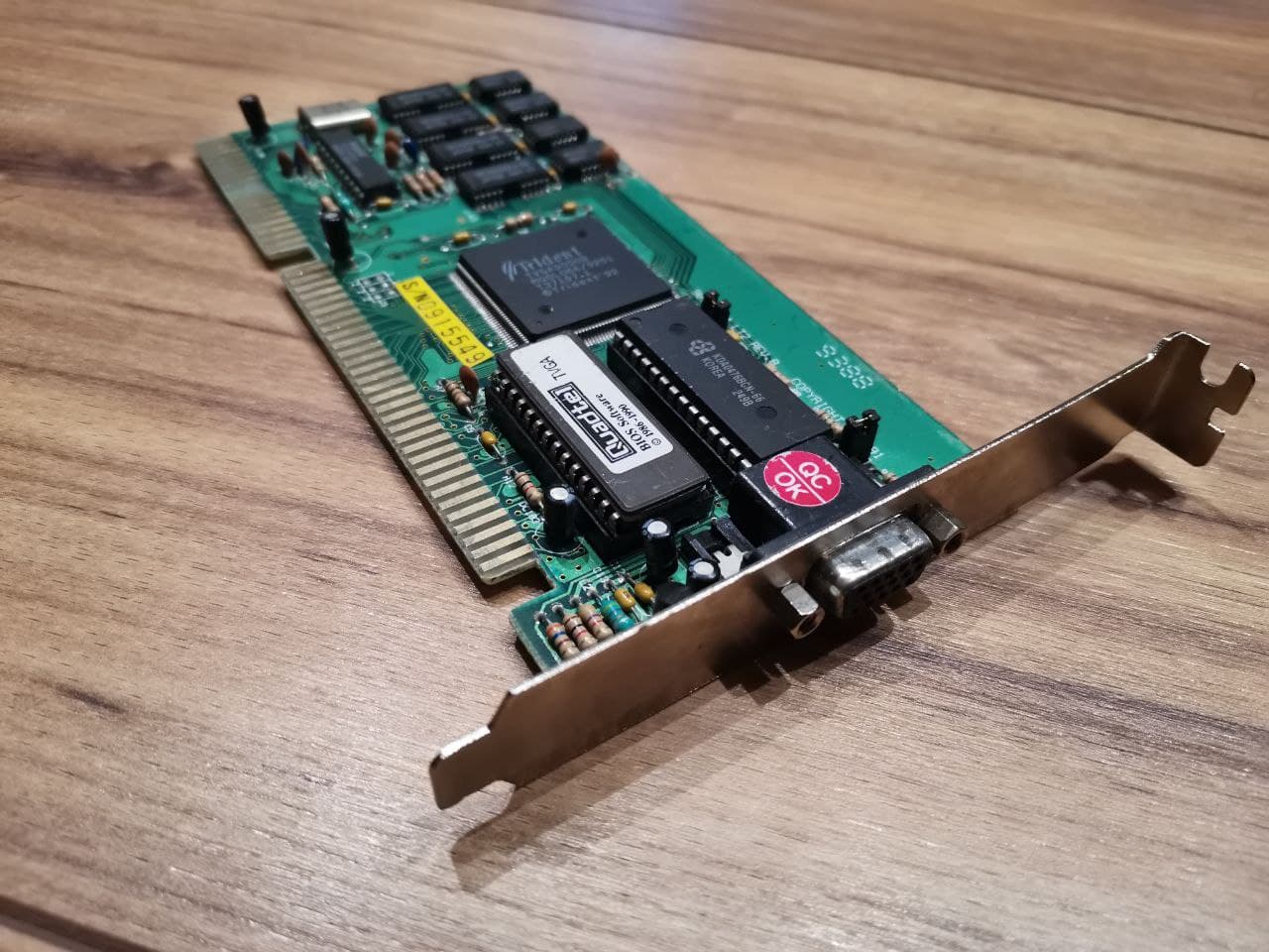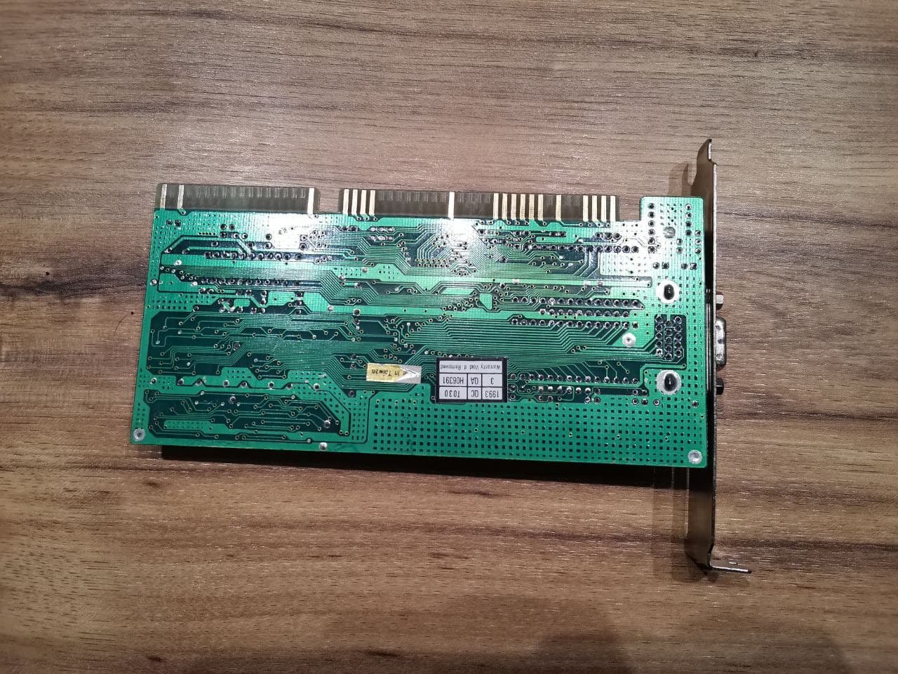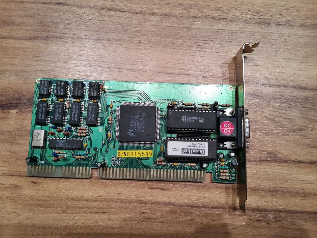Zum Schluss folgt die Ă€lteste in meinem Besitz befindliche Karte aus dem Jahre 1992: Die Trident TVGA 9000B mit 512KB VRAM FPMund einem Kerntakt von 40MHz. Dies ist meine einzige Karte mit ISA-Schnittstelle. Sie sieht etwas komisch aus, als wĂ€re eine Schnecke auf dem Rand der Platine rumgewandert, aber dies war nicht der Fall, dafĂŒr lege ich meine Hand ins lauwarme Wasser!