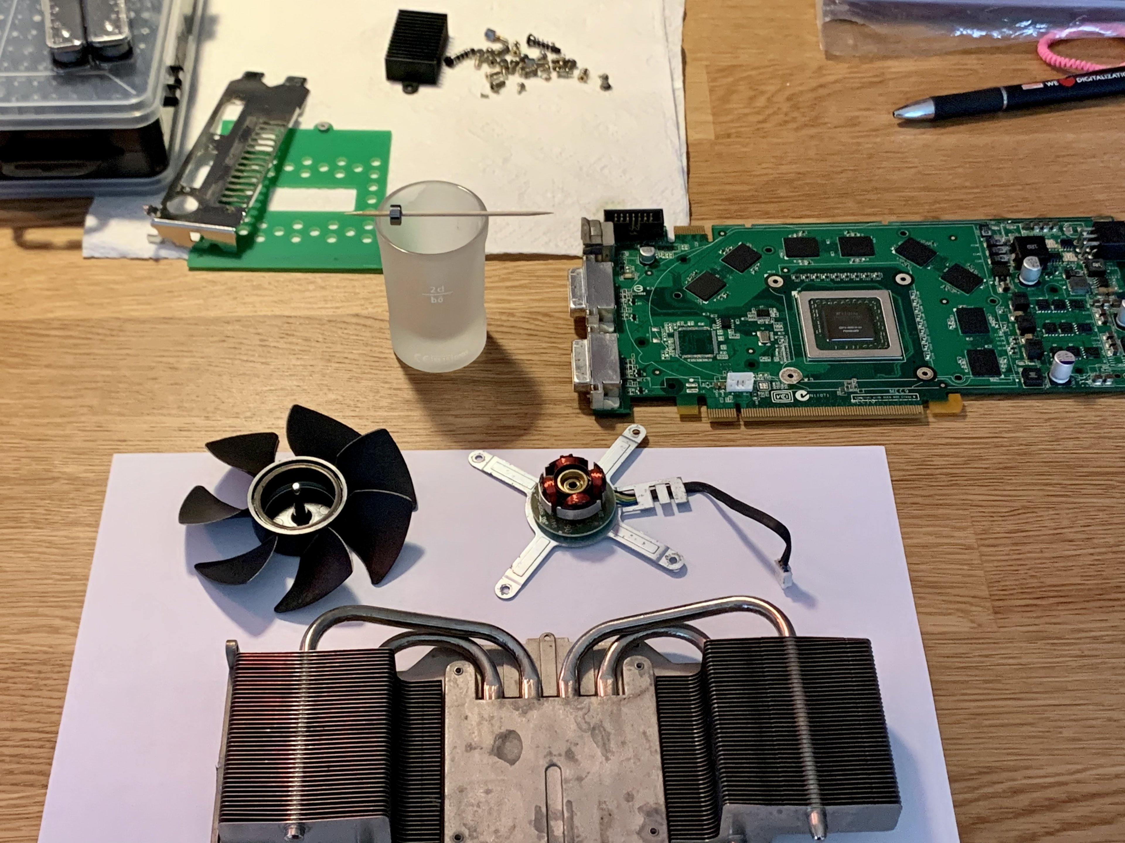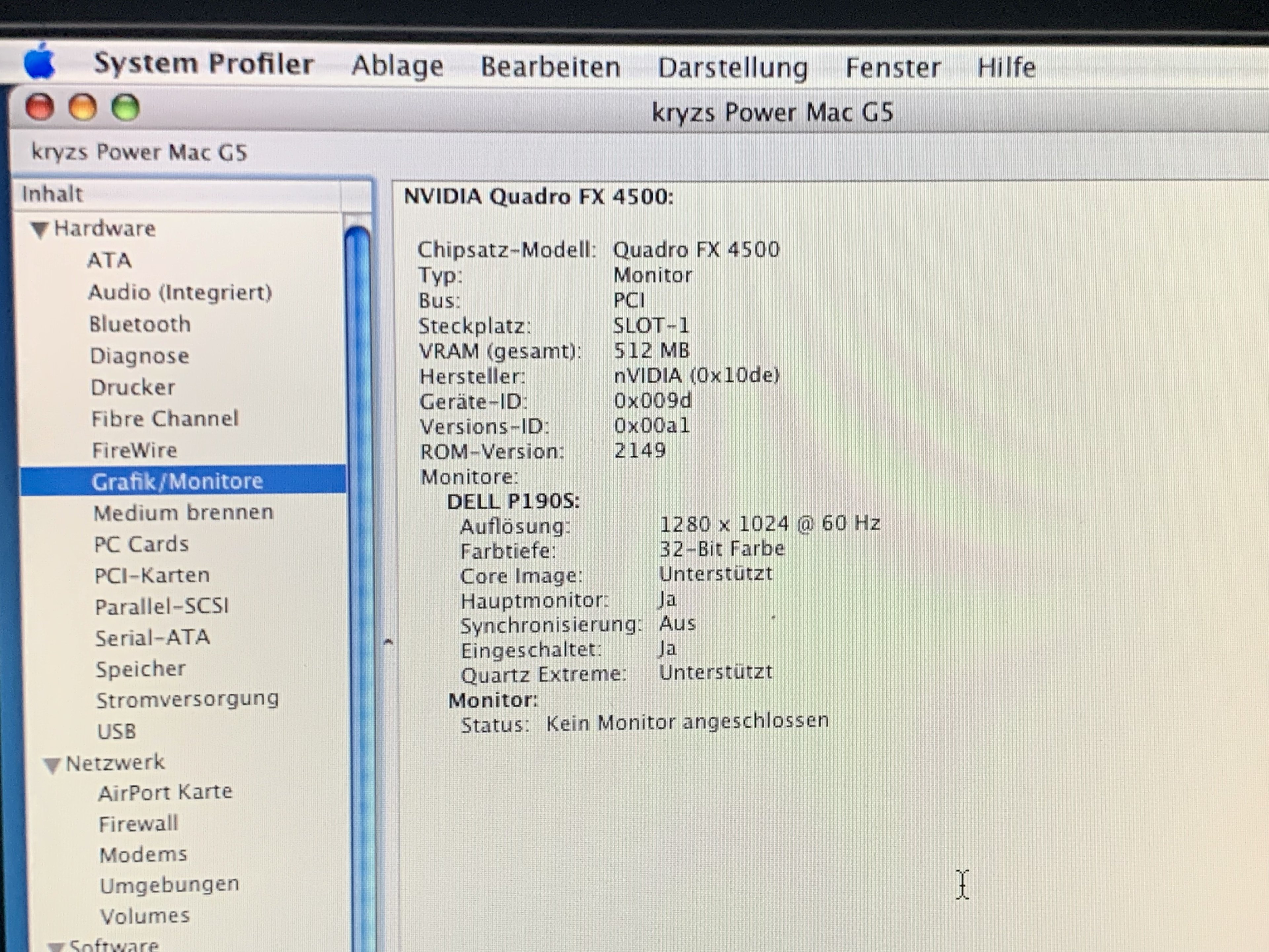 Die Grafikkarte wurde durch eine X1900GT ersetzt und Mac-tauglich gemacht. War soweit, wenn man vom RAM absieht, auch alles gut, lief wunderbar, war mir aber etwas zu laut, daher hab ich mir eine Quadro FX 4500 besorgt, …