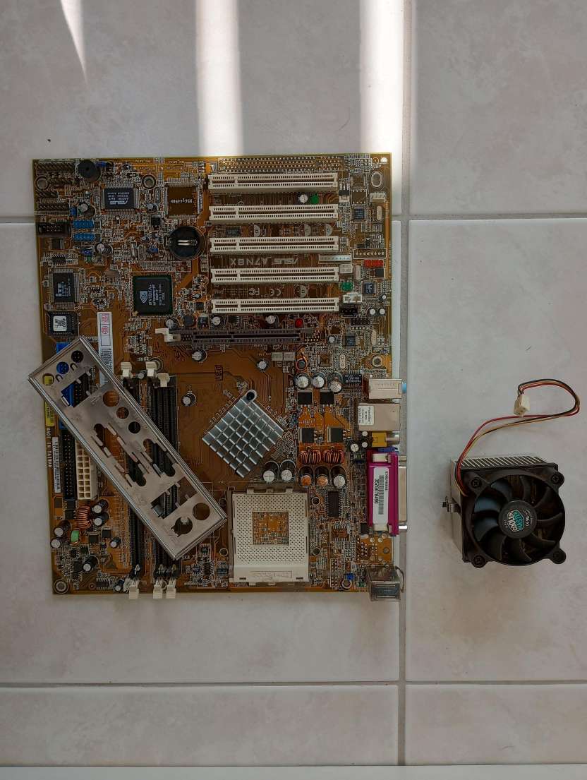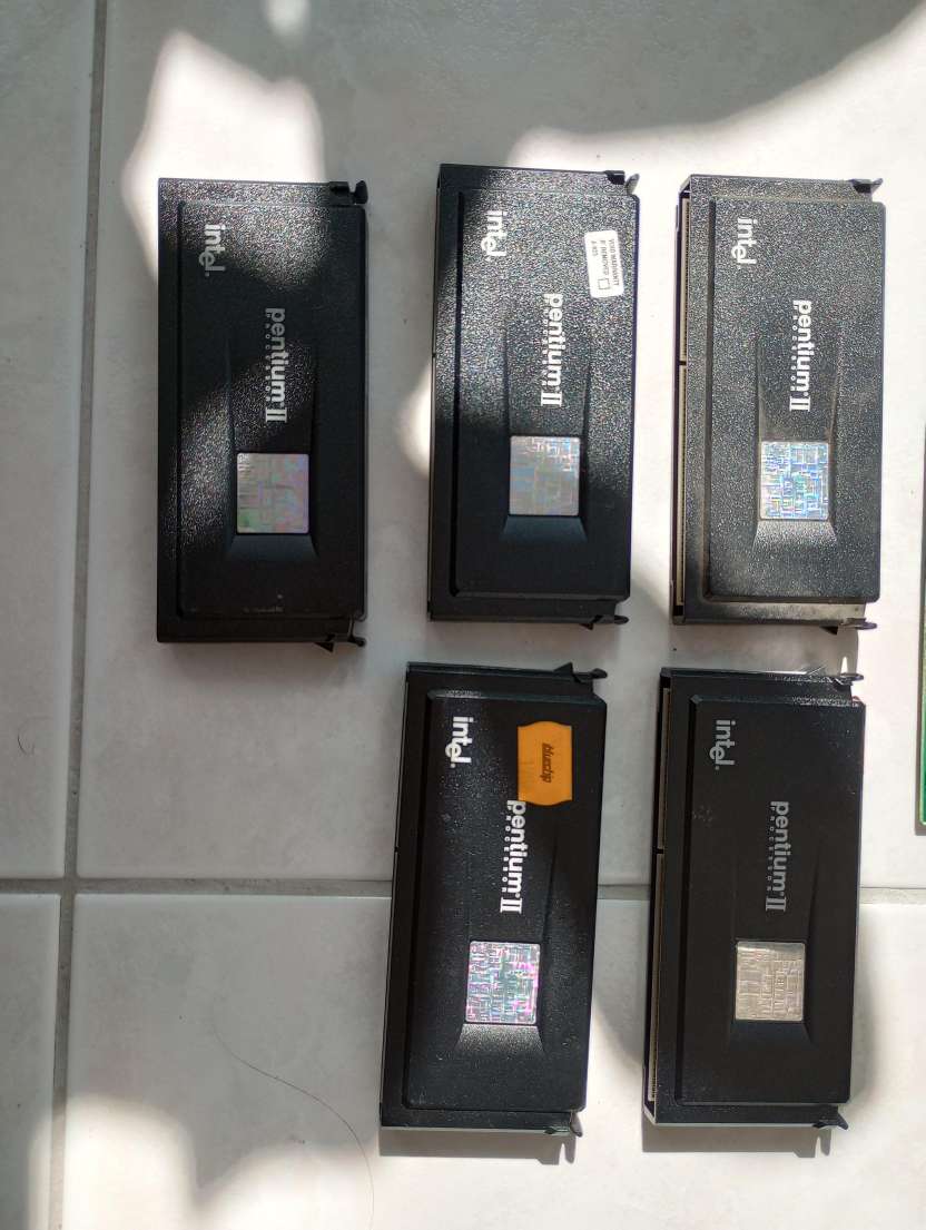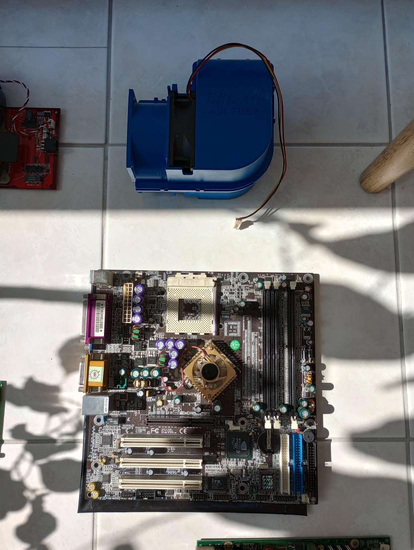 Einige Sachen fand ich nicht so spannend, aber es lagen auch noch zahlreiche Pentium III + Celerons, viele mobile Pentiums, ein mATX nForce 2 Mainboard von Chaintech, ein ASUS A7N8X mit matschigen Elkos, eine FX 5200 PCI mit matschigen Elkos, eine Voodoo 3 3000 AGP ohne Kühlkörper und einige Pentium 1 und 2 rum. Ich hab noch mehr Detailbilder gemacht, falls jemand mehr Infos braucht.