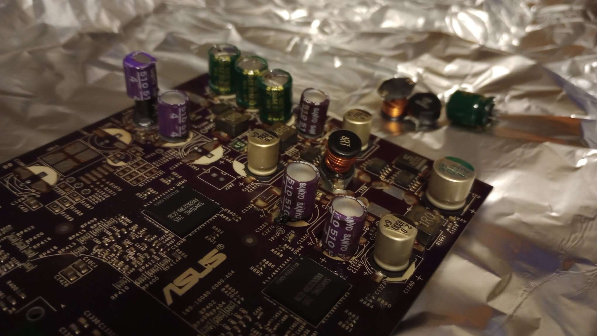 Hab eine Geforce 4 TI 4400 reinbekommen - PCB etwas krumm und die Karte produziert Grafikfehler. Also Kühler abgenommen und die Karte in Alufolie eingewickelt für eine Backofen-Session. Da 150° in der Vergangenheit nie was gebracht haben, war ich dieses mal mit 200° und Umluft besonders mutig. Und ich hab die Karte mit dem PCB nach oben in den Backofen gelegt.