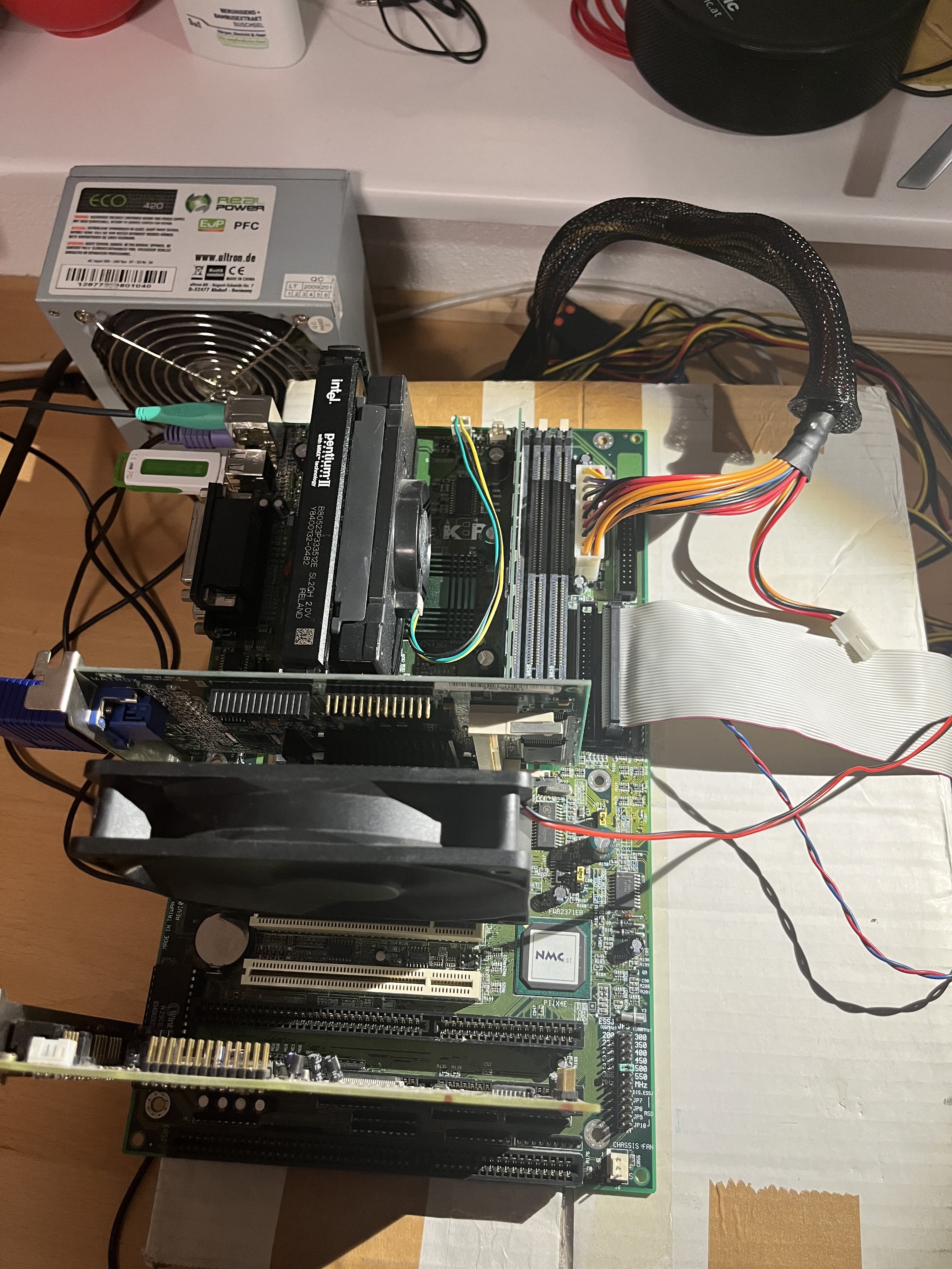 Da hockt momentan ein Pentium MMX 200 drauf mit 32 MB Ram, es ist aber eines von meinen "Hart im nehmen" MoBos, die auch ohne Probleme einen Ur 686 Cyrix oder IBM aufnehmen können, ohne dabei zum Feuerball zu werden...