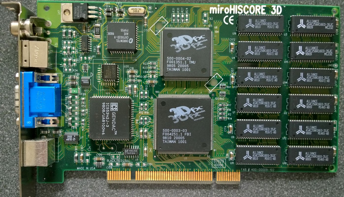 Die Voodoo Rush war die erste 2D/3D Kombikarte mit Voodoo Chip. Hatte meine Mutter auch, ich glaub die CDs mit den Spielen hab ich sogar noch irgendwo, aber die GPU ist meine ich weg. War in der Tat zu ihrer Zeit nicht die flotteste, aber wenn man diesen VGA-Kabelsalat vermeiden wollte ne brauchbare Alternative.