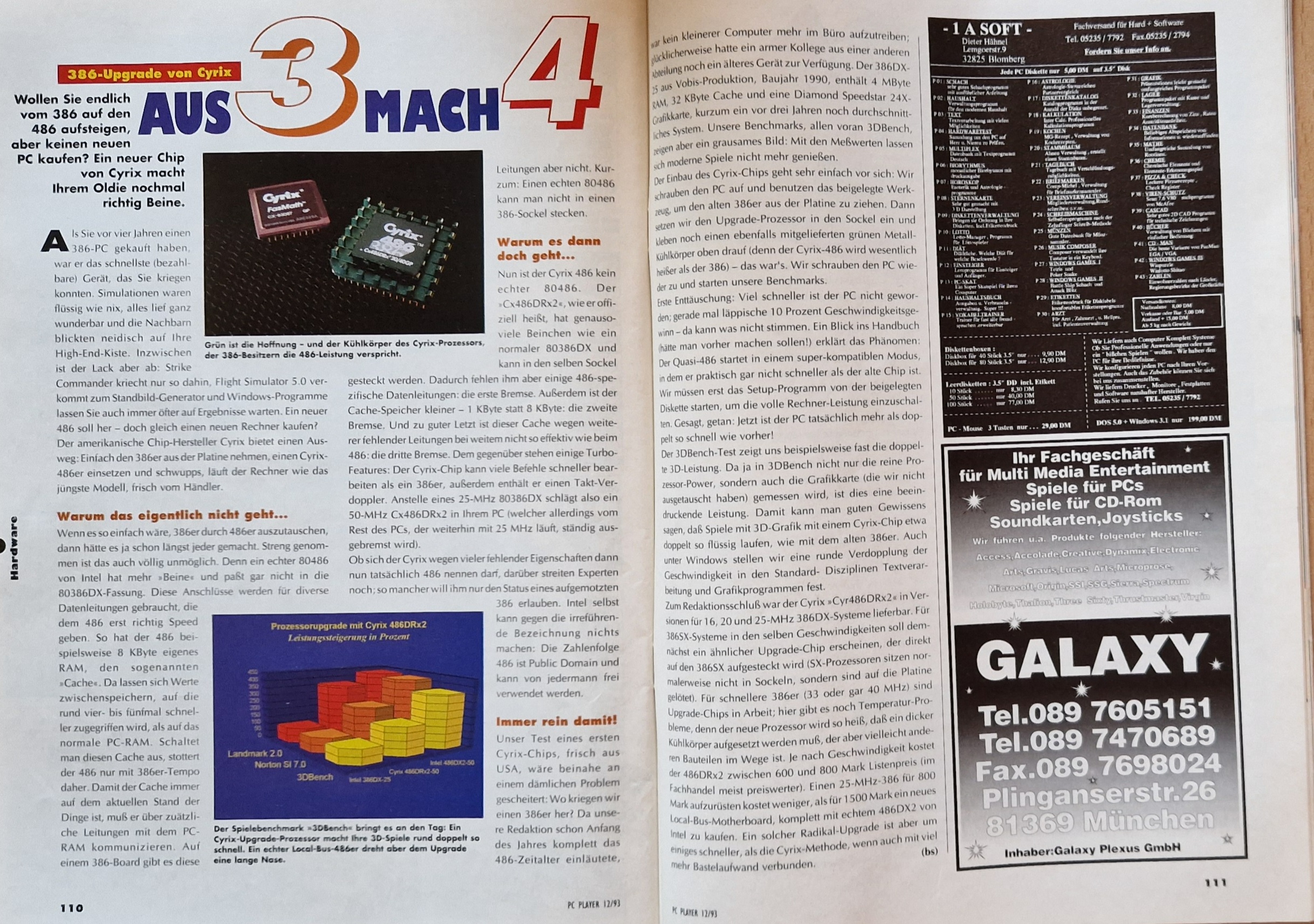 "Aus 3 mach 4" - Mir bislang unbekannter (bzw. vergessener, das Heft hab ich irgendwann mal gelesen) Cyrix Overdrive Prozessor für 386er. Heft 12/93: