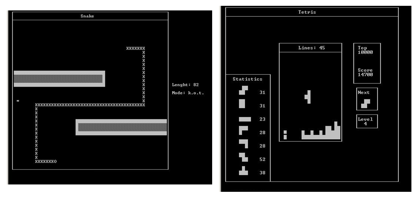 Habe unter anderem Snake unter C als Konsolenanwendung geschrieben. Gab bei Snake den klassischen Endlos Modus. Dazu habe ich noch eine handvoll verschiedener Welten entworfen mit Wänden und anderen Objekten, die man nicht treffen durfte. Man konnte einstellen wie viel man Futtern musste um ins nächste Level zu kommen und man konnte die Geschwindigkeit über den Schwierigkeitsgrad ändern.
