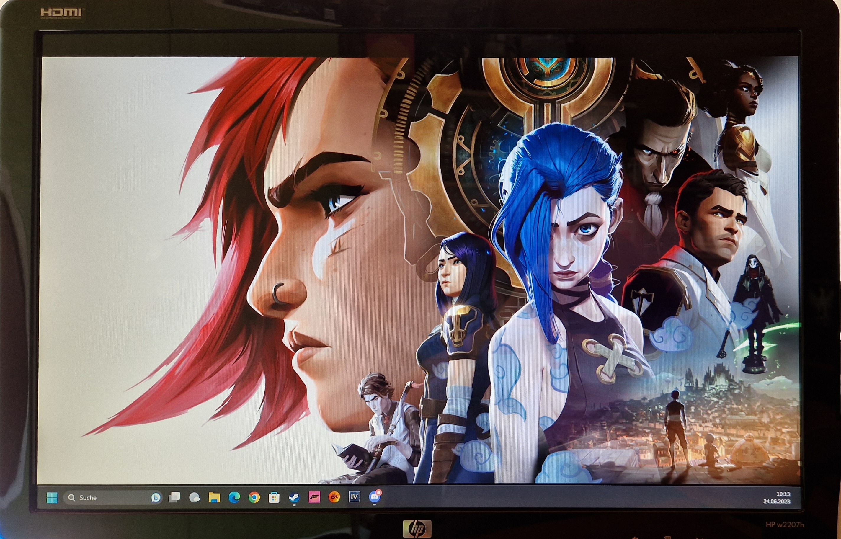 Moin, das ist aus der Netflix Serie Arcane - League of Legends. Kann ich nur wärmstens empfehlen, die 6 Jahre Produktionszeit sieht man der Serie an: Zeichenstil, Soundtrack, Story/Charaktere, hat mir super gefallen. Und ich spiele nicht mal League of Legends. Das Wallpaper findet man fast sofort wenn man nach Arcane sucht, ich weiß gar nicht mehr woher meins ist, hier habe ich es u.a. gefunden.