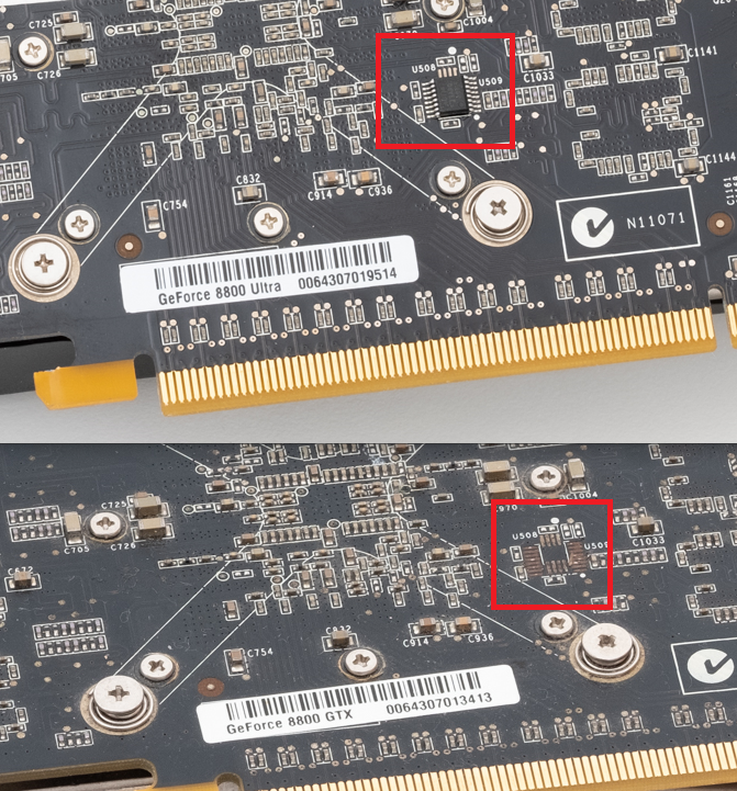 Ist leider nicht nur ein einfacher Widerstand, aber ich muss mal gucken, die ACS³ hatte massive Bildfehler, eventuell lässt die sich auch mit Reflowmethoden retten, falls nicht, hat die Karte den Chip ja auch drauf und wäre somit Spender für den Spender ^^ . Ich hab jetzt auf Anhieb nur noch ein Foto von einer meiner Ultras, aber der Chip sollte analog auch auf der GTX dort sitzen:
