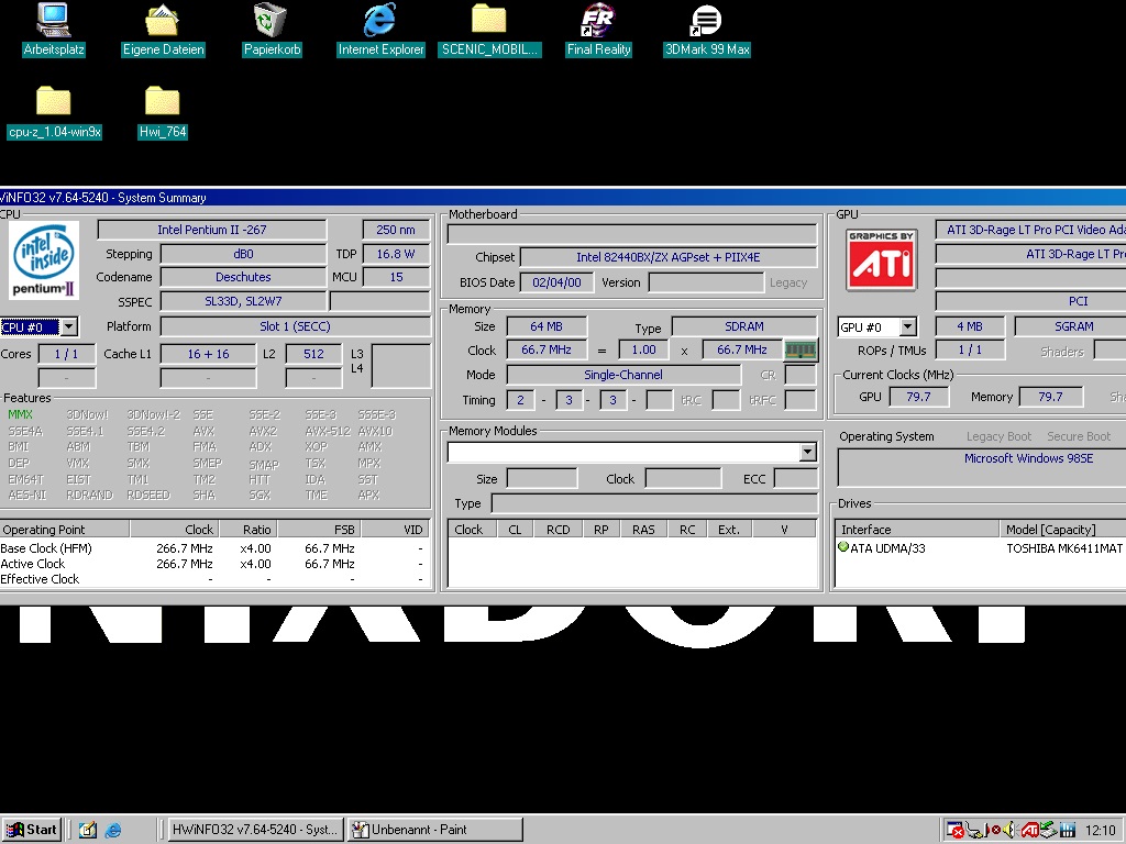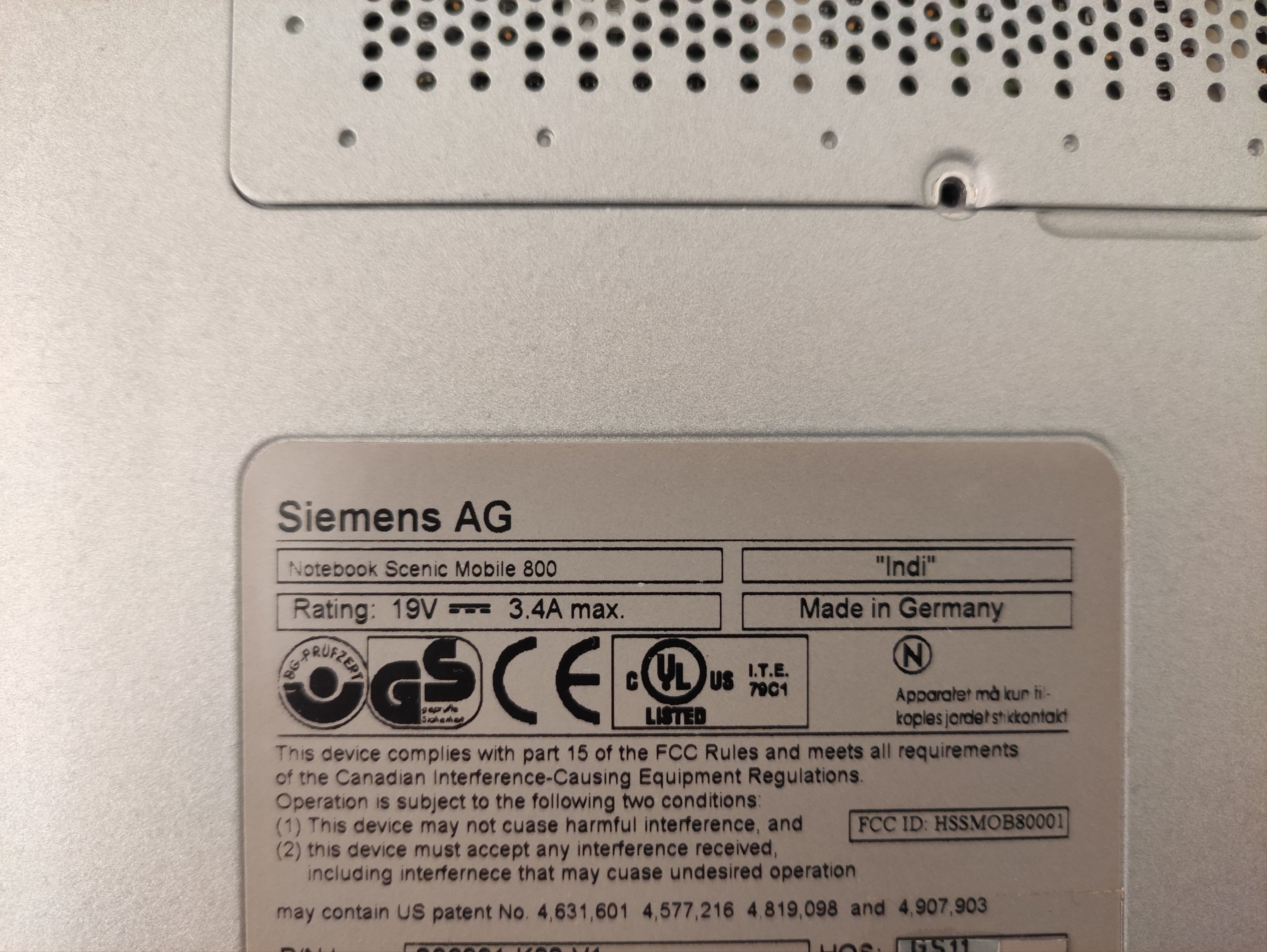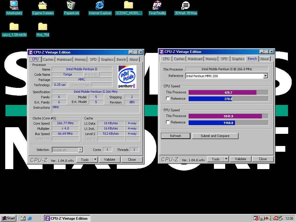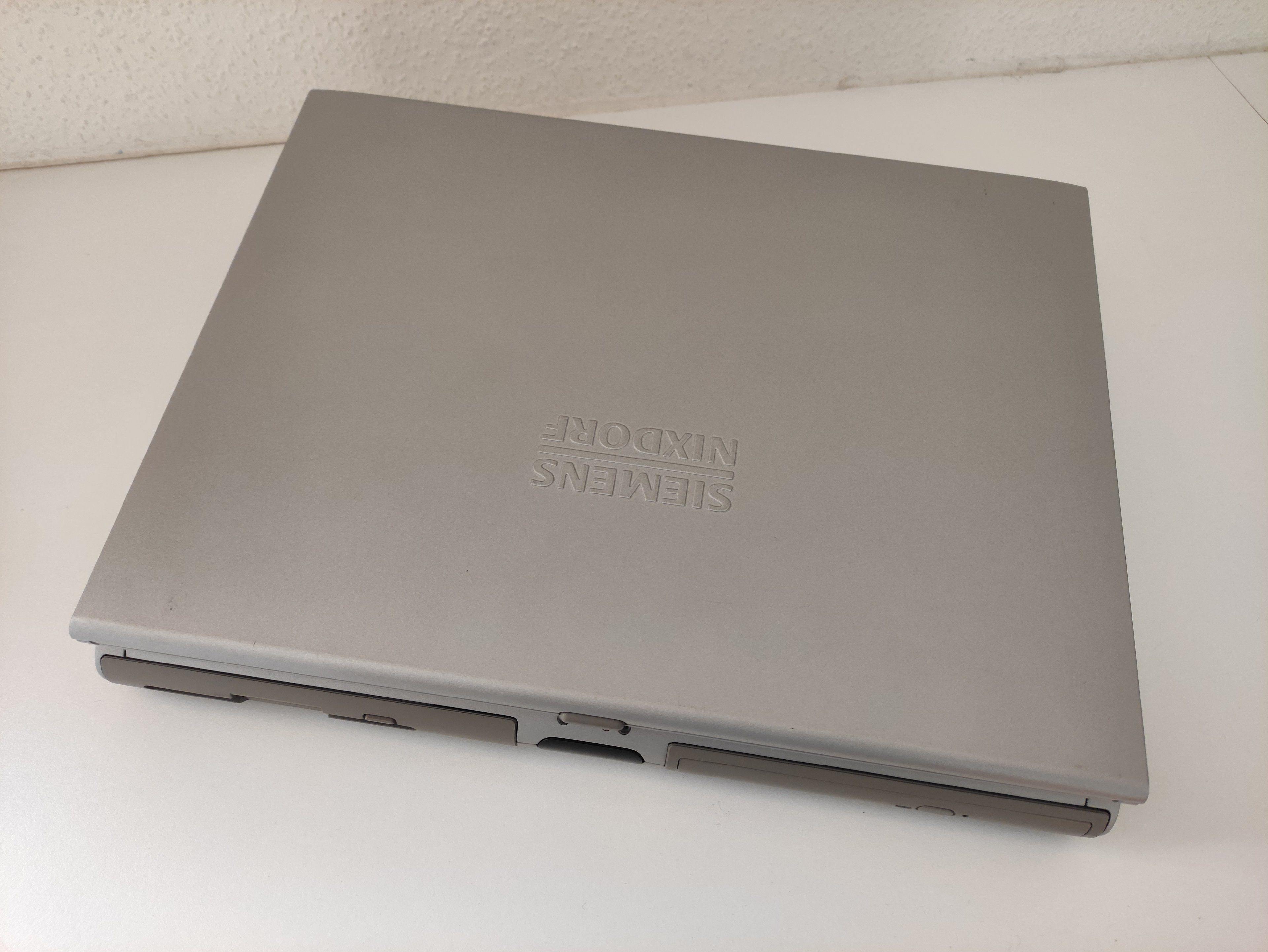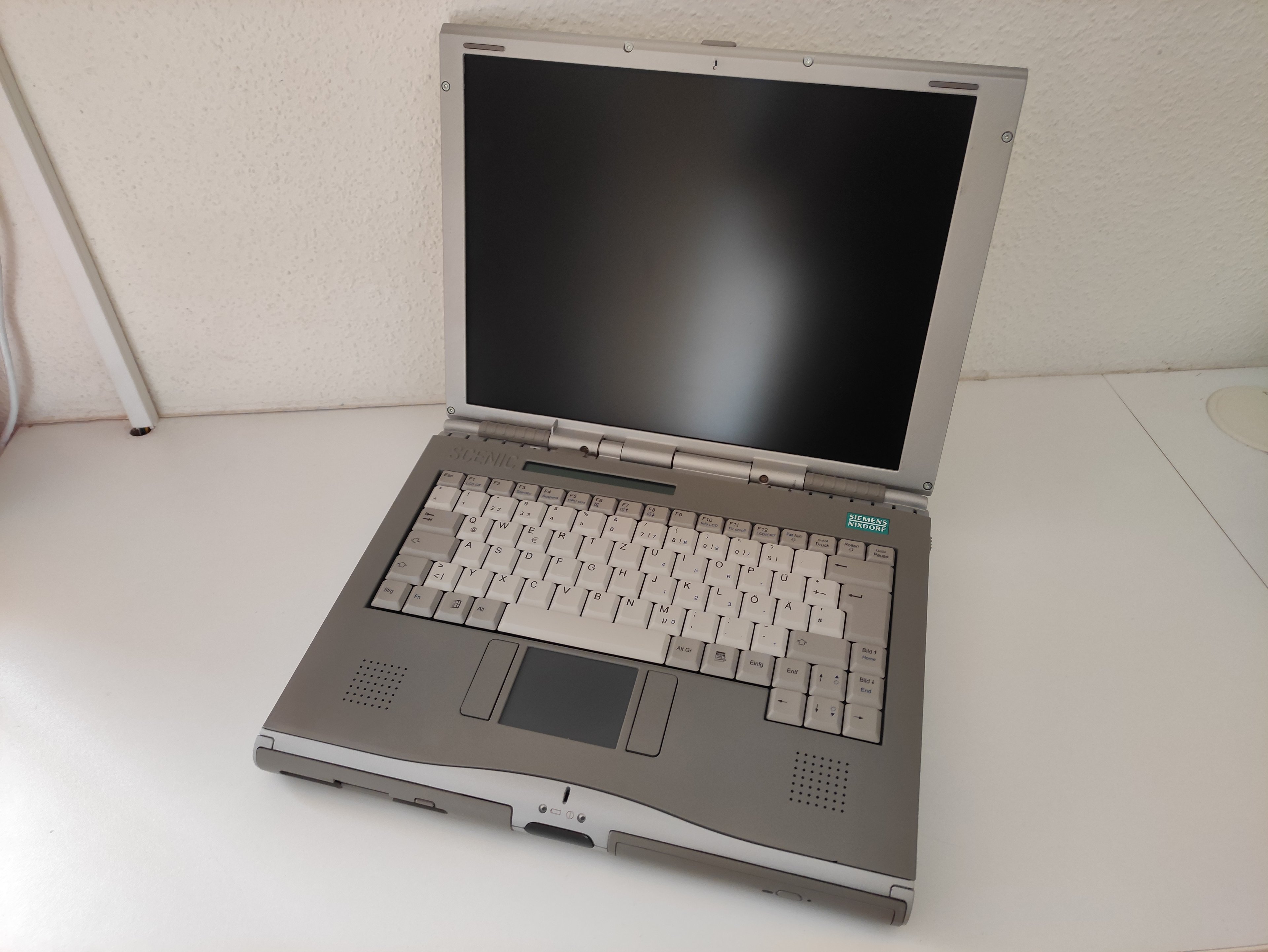 Hier ein Siemens Nixdorf Scenic Mobile 800 (Codename "Indi") mit Pentium II 266MHz, 64MB Arbeitsspeicher und ATi RAGE LT Pro PCI (4MB). Es ist das erste Notebook von Siemens Nixdorf mit Magnesiumgehäuse und hat zudem einen modularen Aufbau. Das Gerät kam ca. Mitte 1998 auf den Markt.